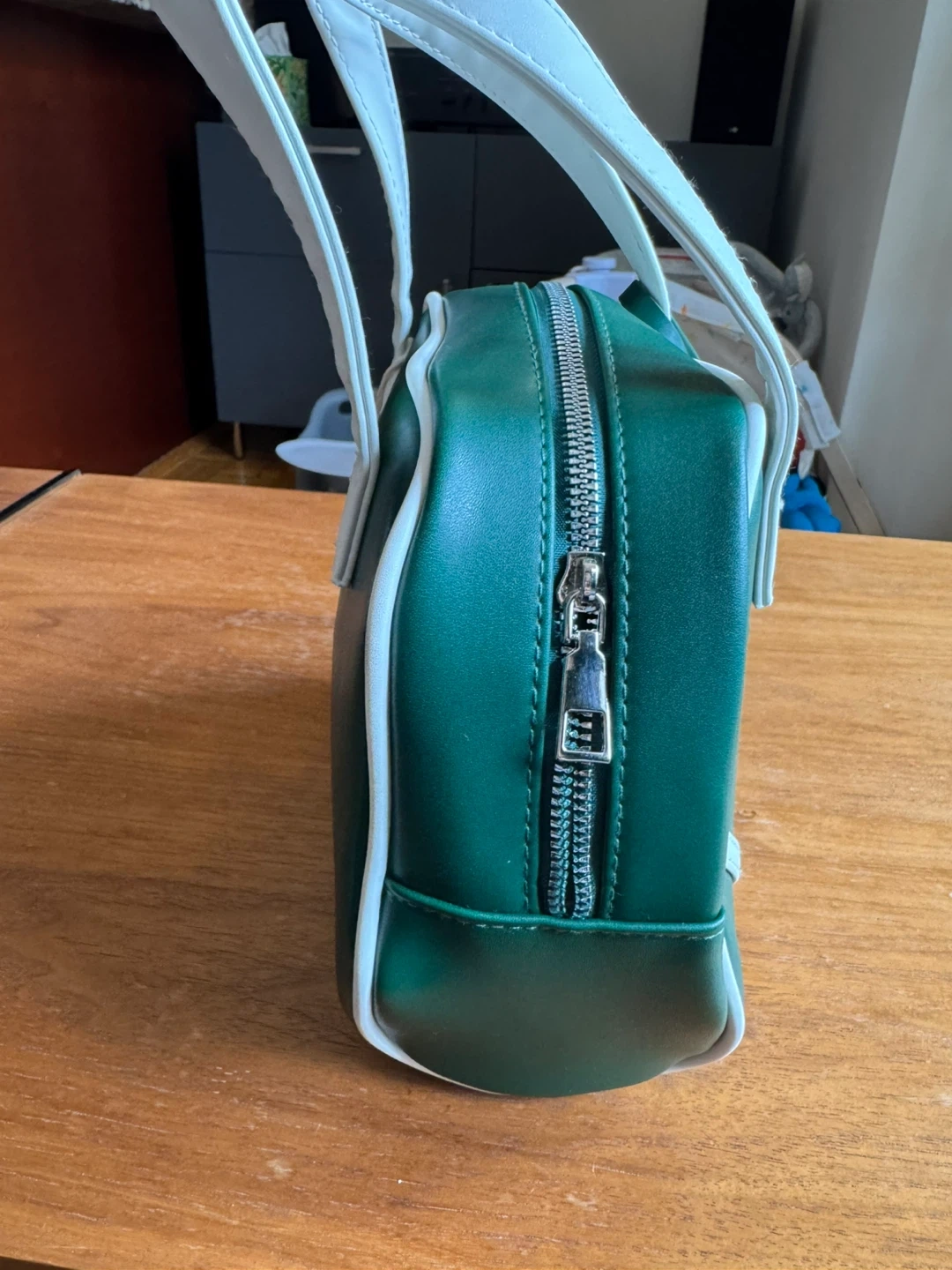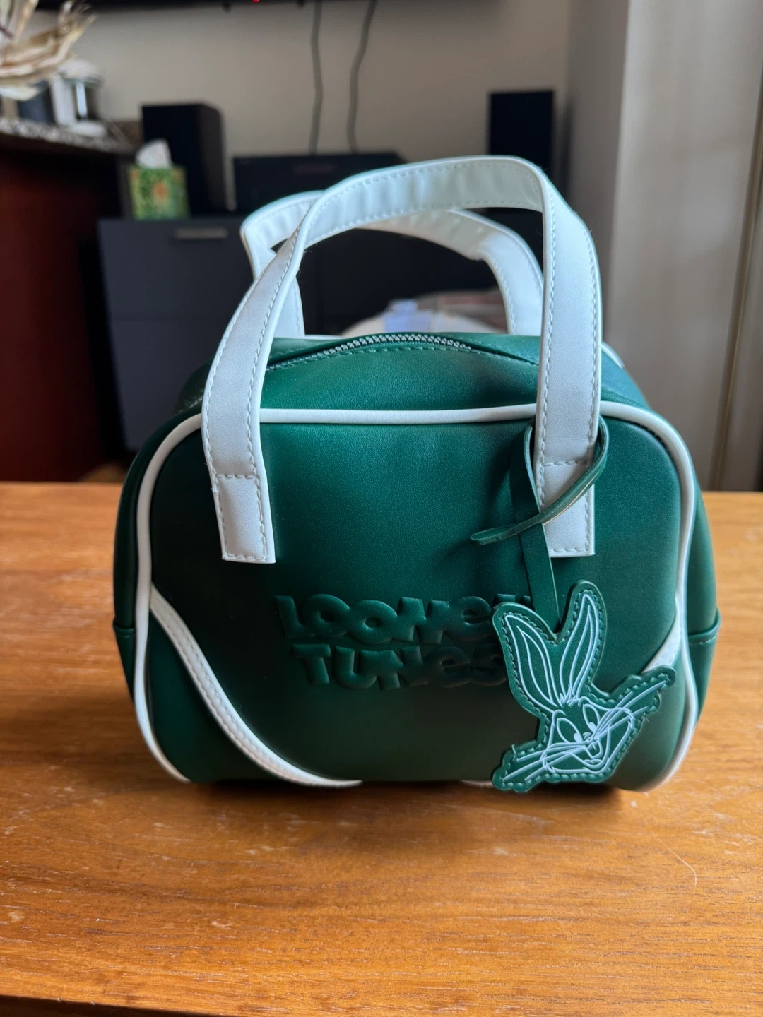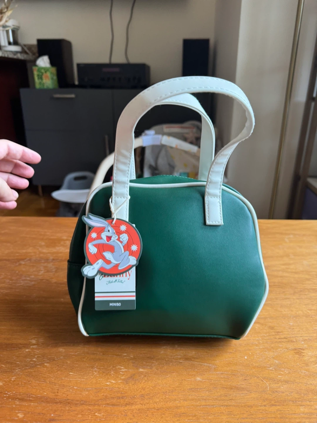 This is a cute Miniso Looney Tunes Bugs Bunny handbag! It's green with white accents and has a Bugs Bunny charm. Perfect for any Looney Tunes fan