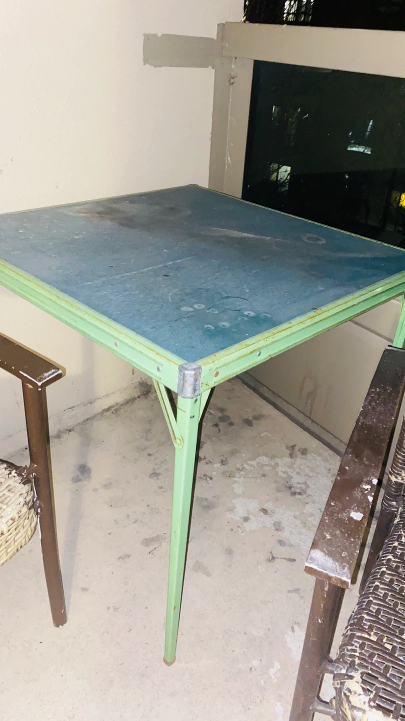 Set of two wicker patio chairs and a matching foldable table. Metal frames on chairs, with a green metal table with wooden top. Great for a balcony or small patio space!