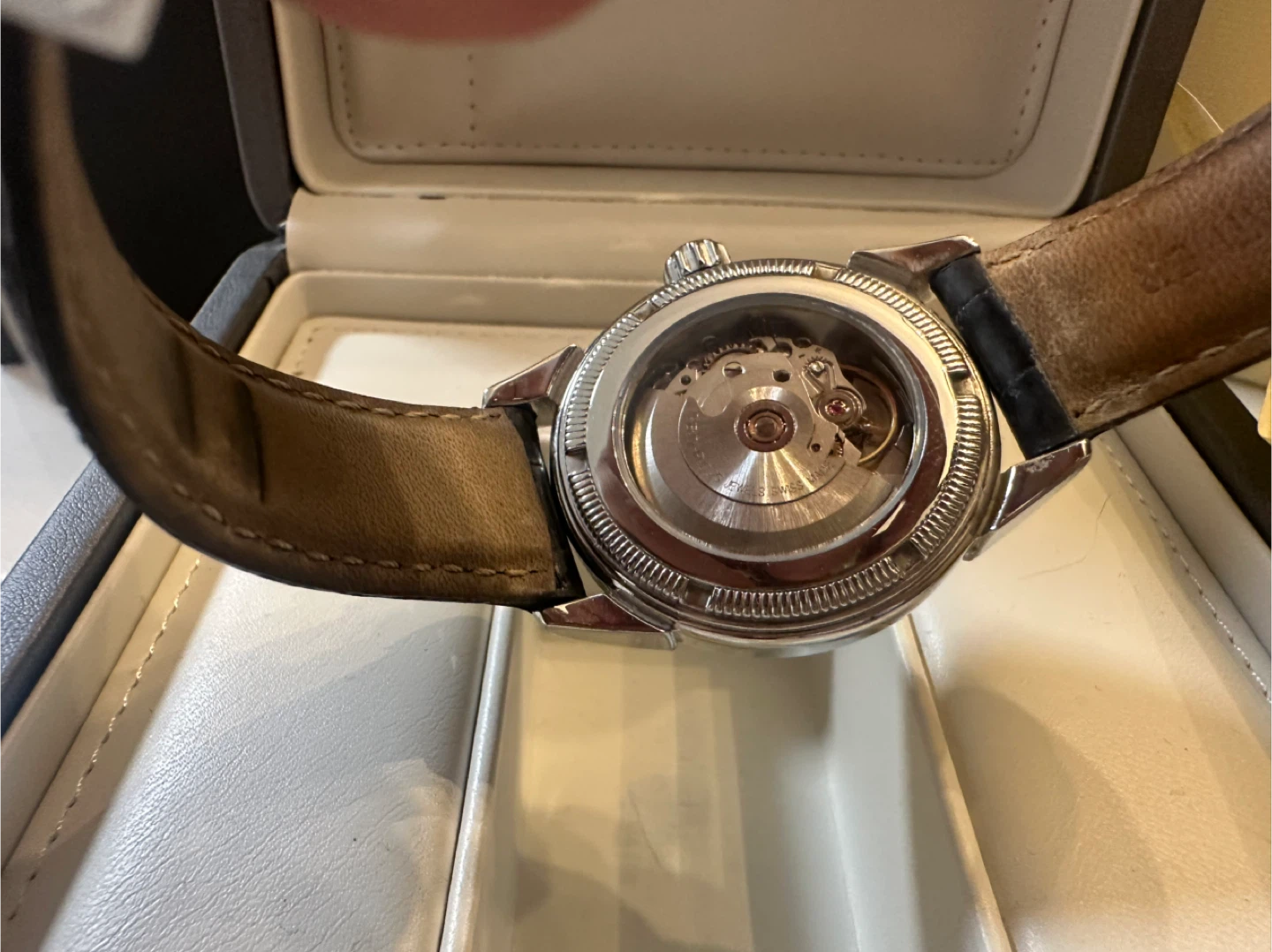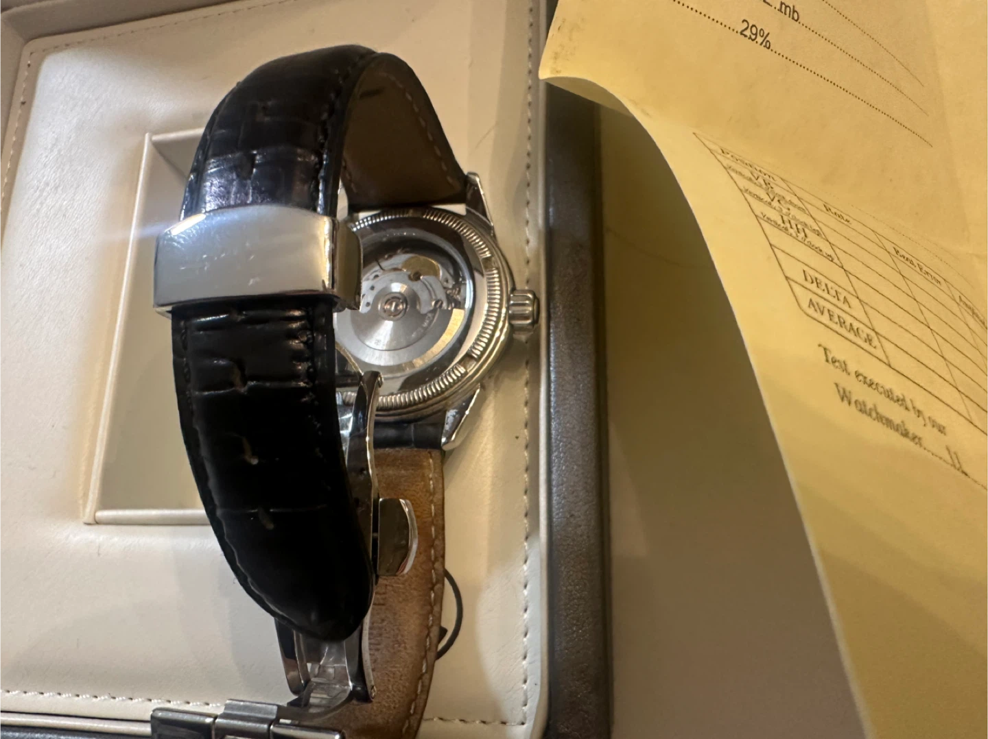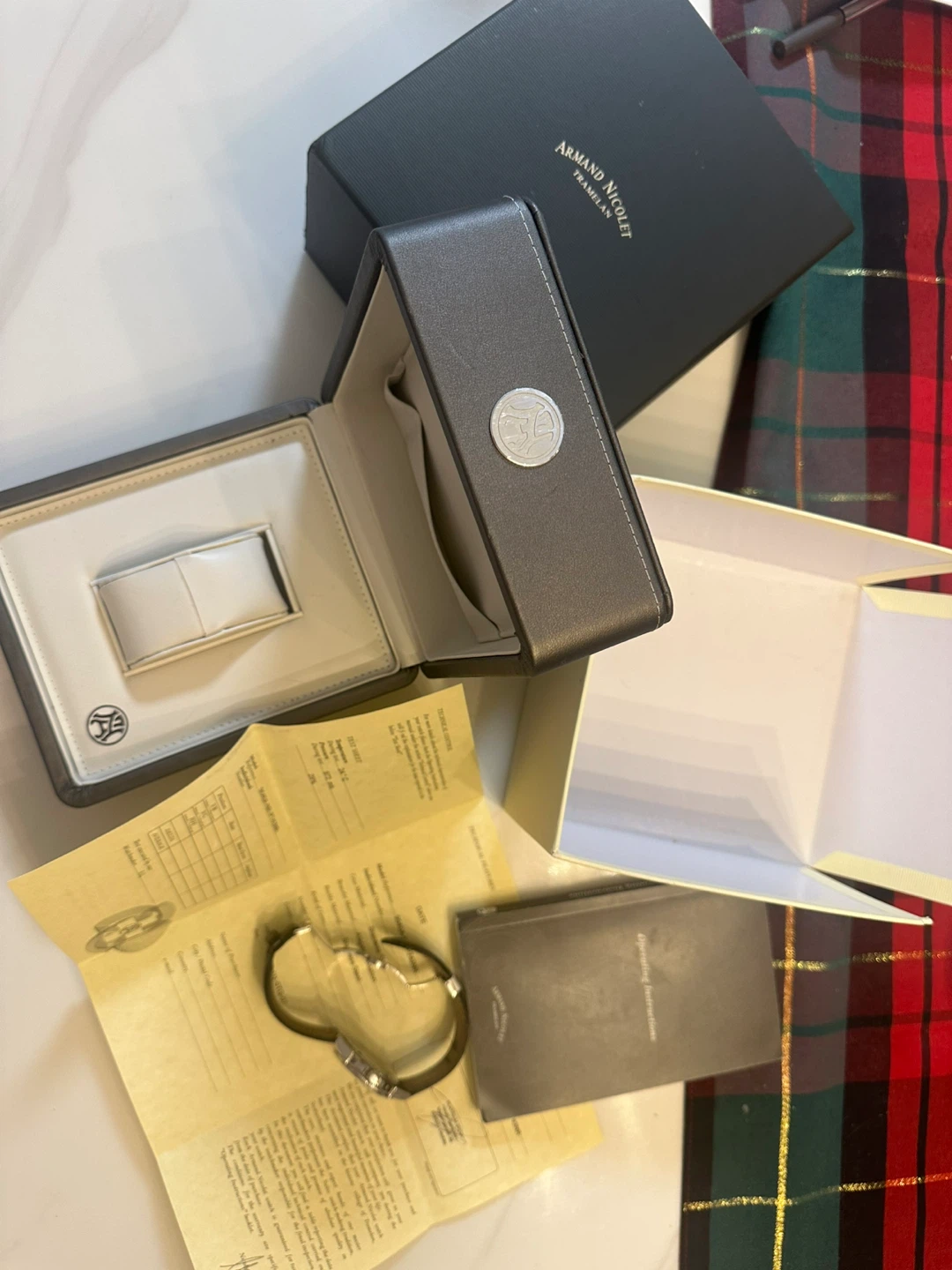 Selling an authentic Armand Nicolet self wind watch. It comes with its original box and documentation. The watch features a black clasp strap and a classic design. It's in great condition and ready for a new owner!