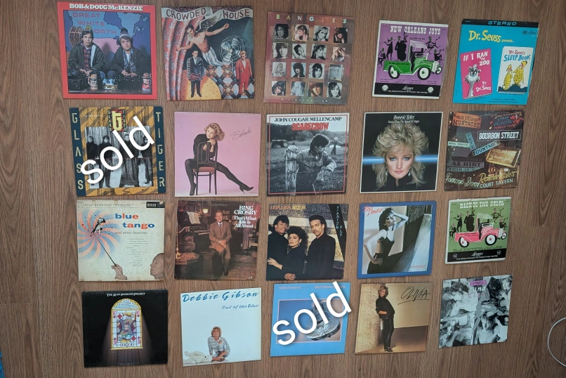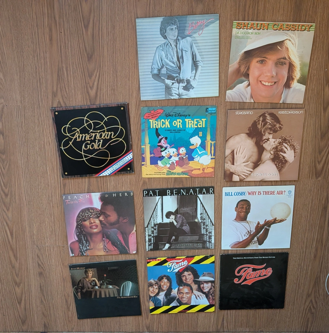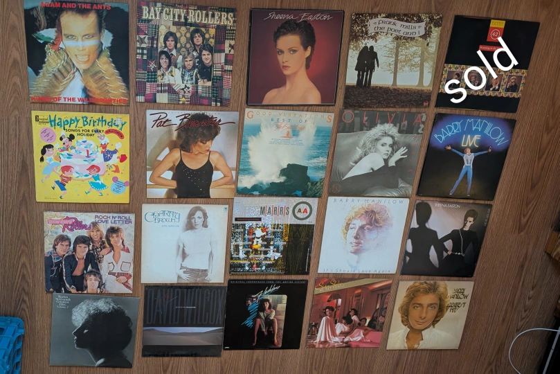 Collection of various vinyl records. Includes artists like Barry Manilow, Pat Benatar, and Linda Ronstadt. Records are a mix of genres and decades.