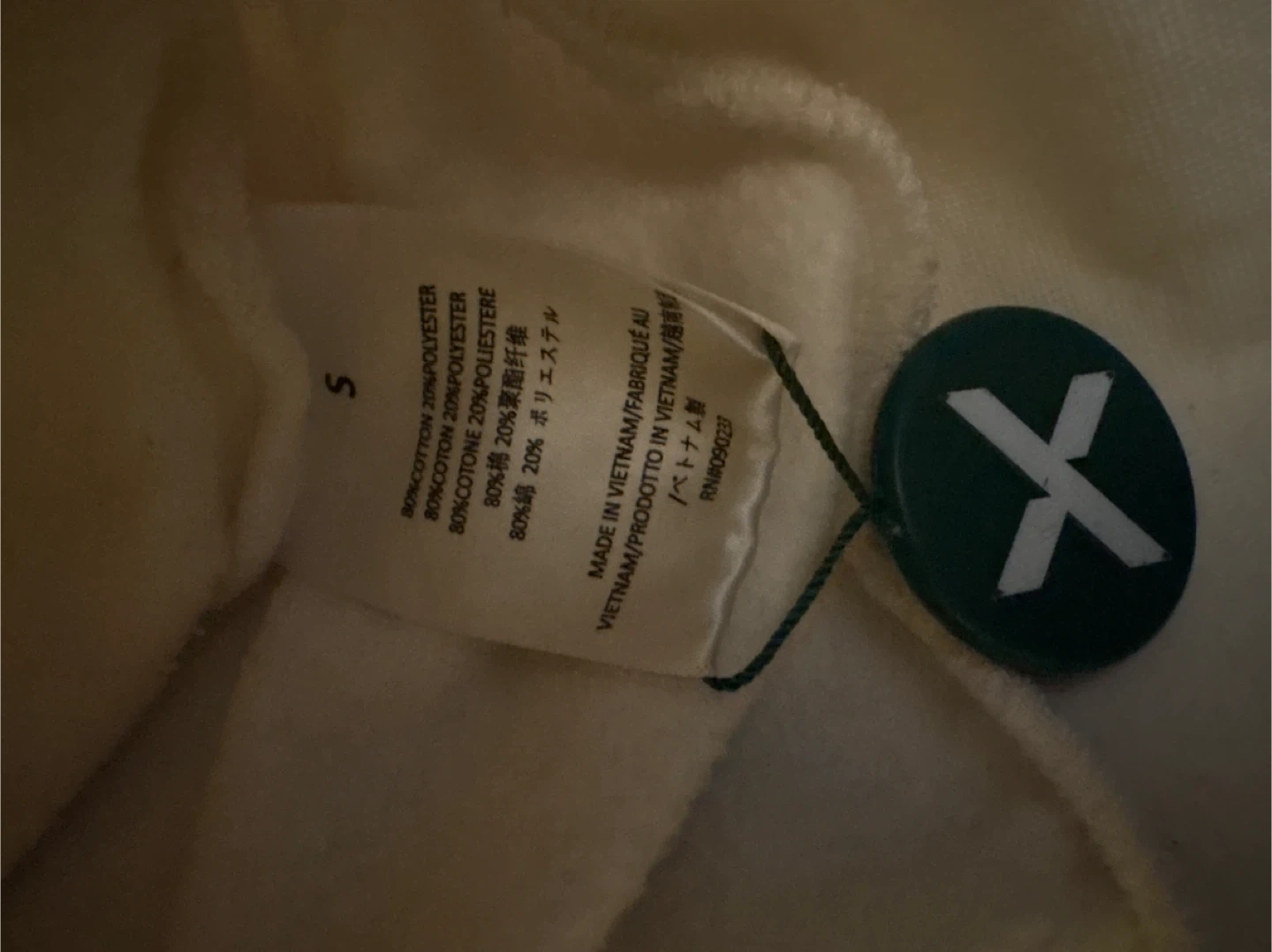 This is a cream-coloured hoodie from Fear of God Essentials. It's made with an 80% cotton and 20% polyester blend. The size is small.