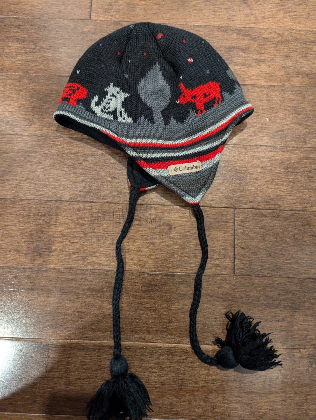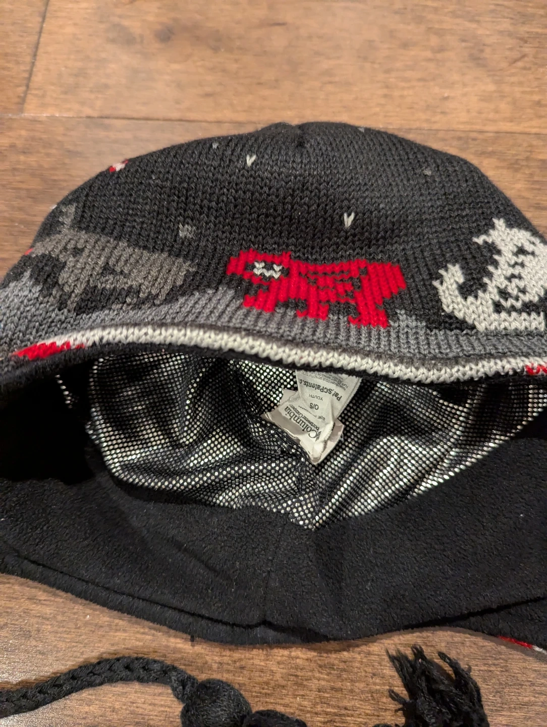 This kid Columbia knit winter hat features a fun woodland animal print. It has ear flaps with tassels for extra warmth. The inside lining is designed for added insulation.