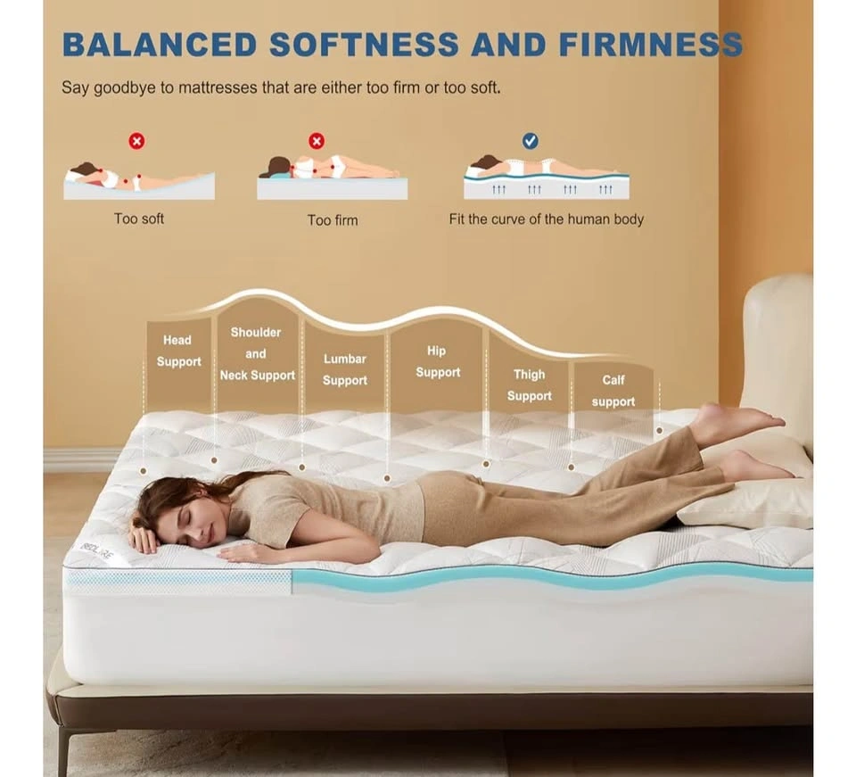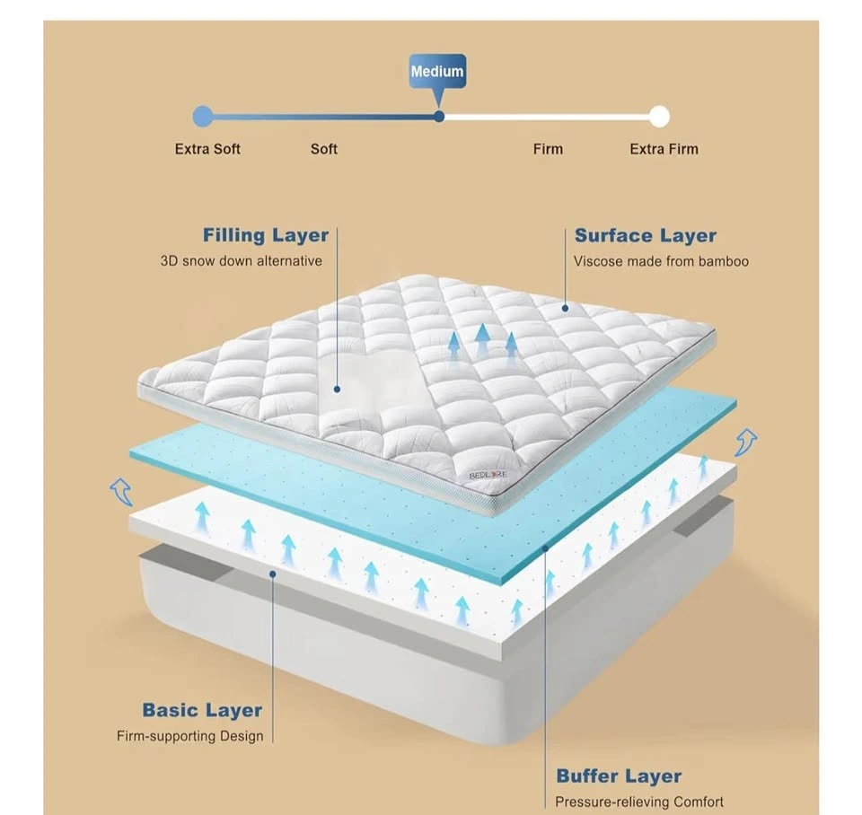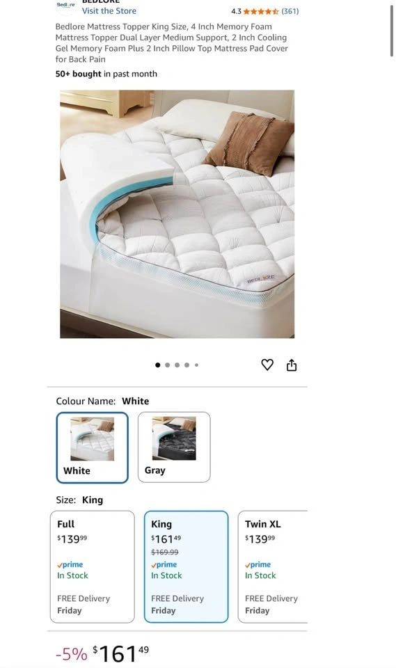 Brand new Bedlore King Size 4-inch mattress topper, still sealed in original packaging. Dual-layer design: 2” cooling gel memory foam + 2” pillow top. Medium support – great for comfort and back pain relief. Helps reduce pressure points. Cooling and breathable material. Fits standard king size beds.