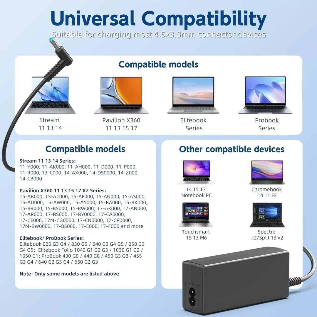 ⚡ Reliable replacement charger compatible with many HP laptops including Stream, Pavilion, Envy, Spectre, ProBook, EliteBook and more.