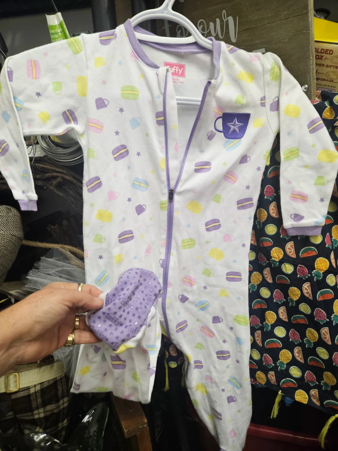 This Tuffy baby sleepsuit is perfect for cozy nights. It features a fun macaron and coffee cup print. Made for comfort and easy diaper changes with a zipper closure. Size 24 months.