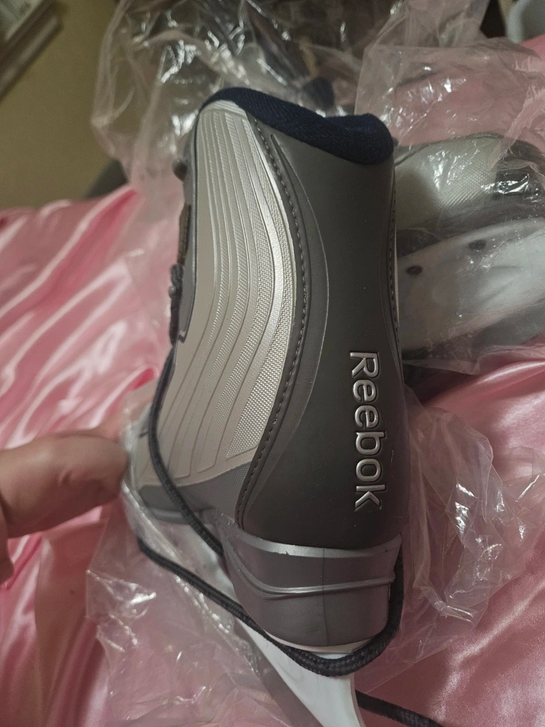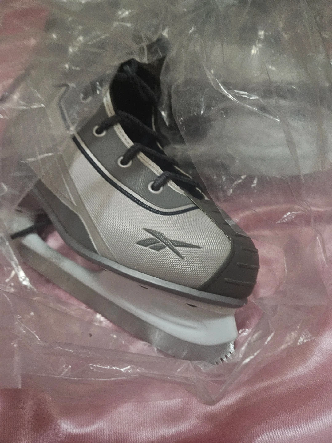 A pair of Reebok ice skates in a silver and grey colourway. Skates come with laces and protective blade covers. They're ready for the ice! Only available at pickup. They fit me and I usually use size 10
