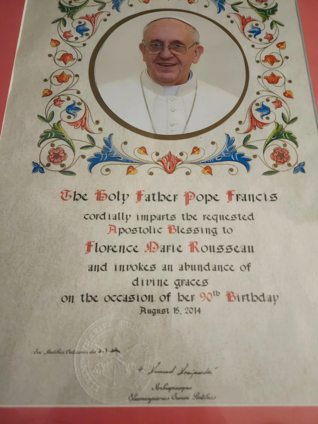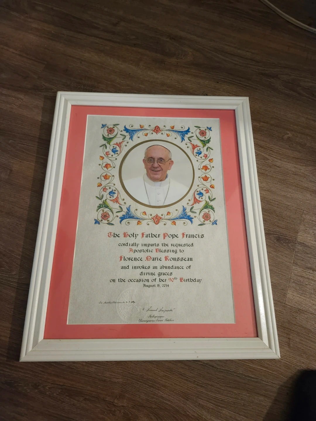 This framed document contains an Apostolic Blessing from The Holy Father Pope Francis, personally imparted to Florence Marie Rousseau on the occasion of her 90th Birthday. The blessing was given on August 16, 2014. It's a beautiful keepsake.