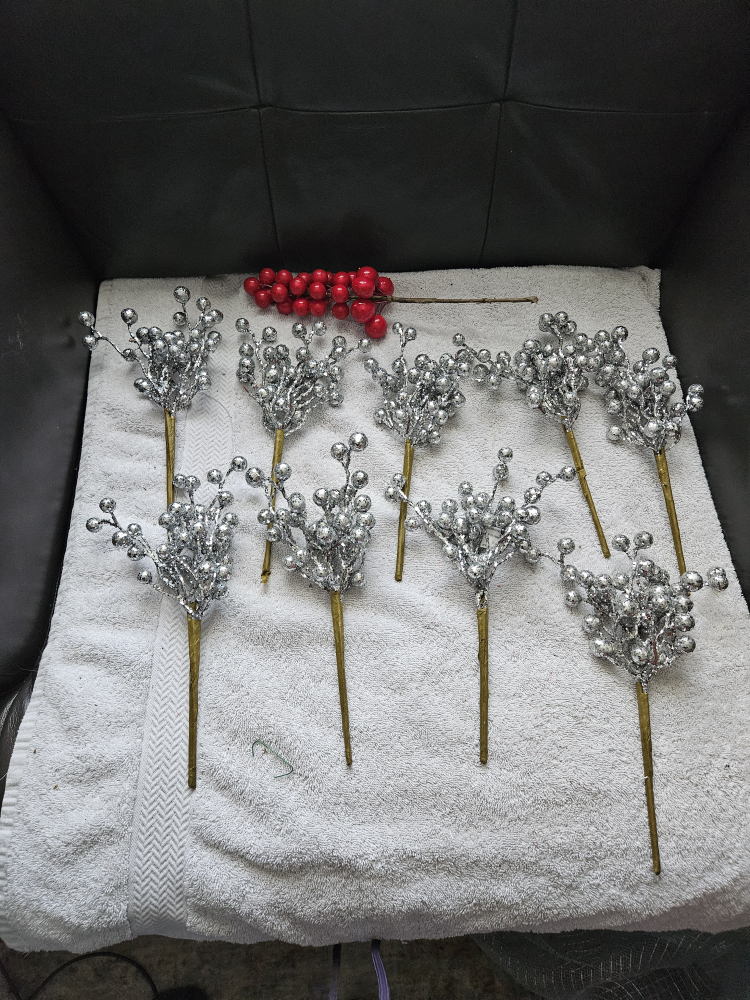 Selling 9 Berry Stems plus 1 bonus red berry stem (red berry stem missing 1 berry). They're perfect for adding to wreaths, garlands, or floral arrangements.