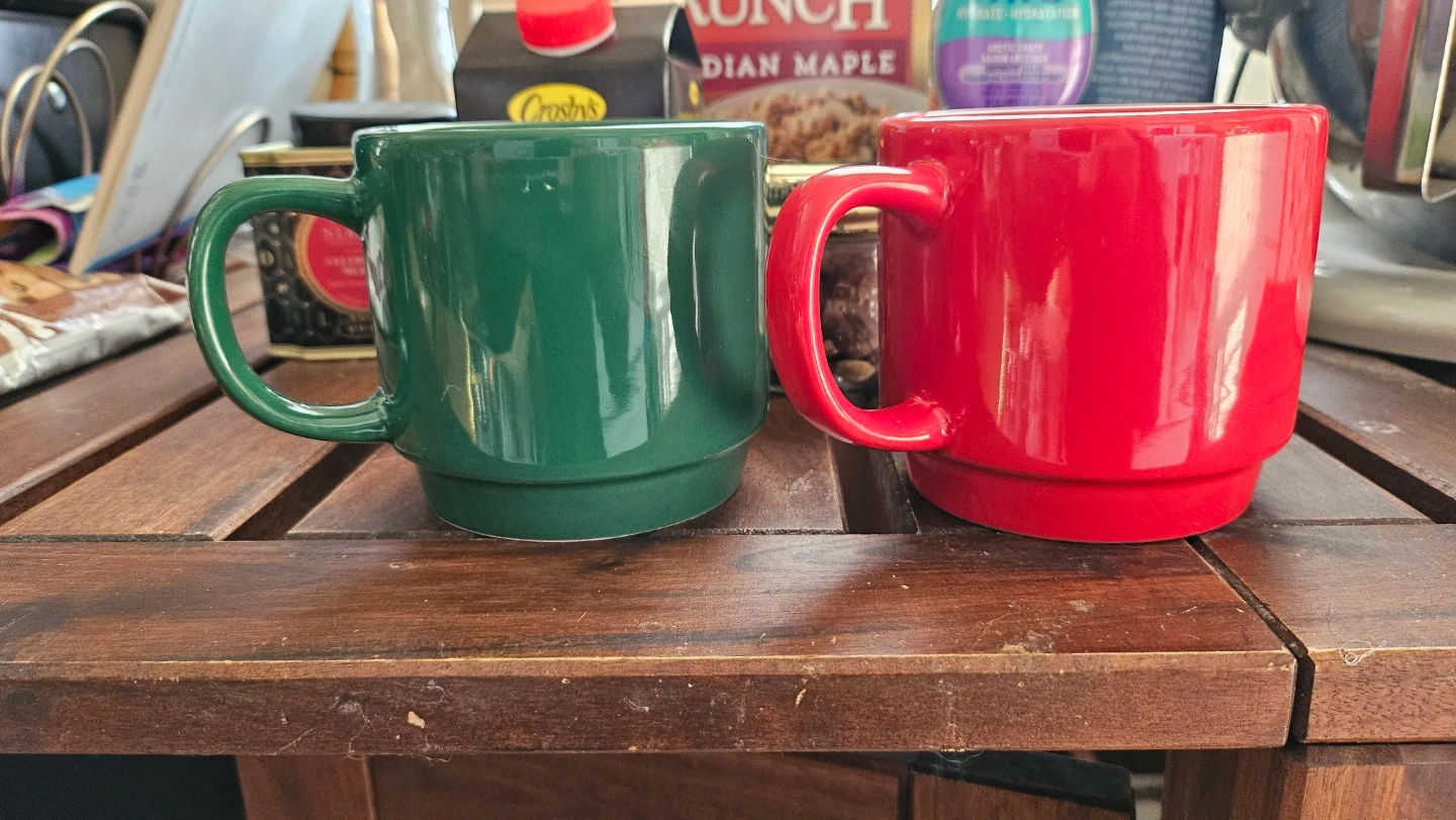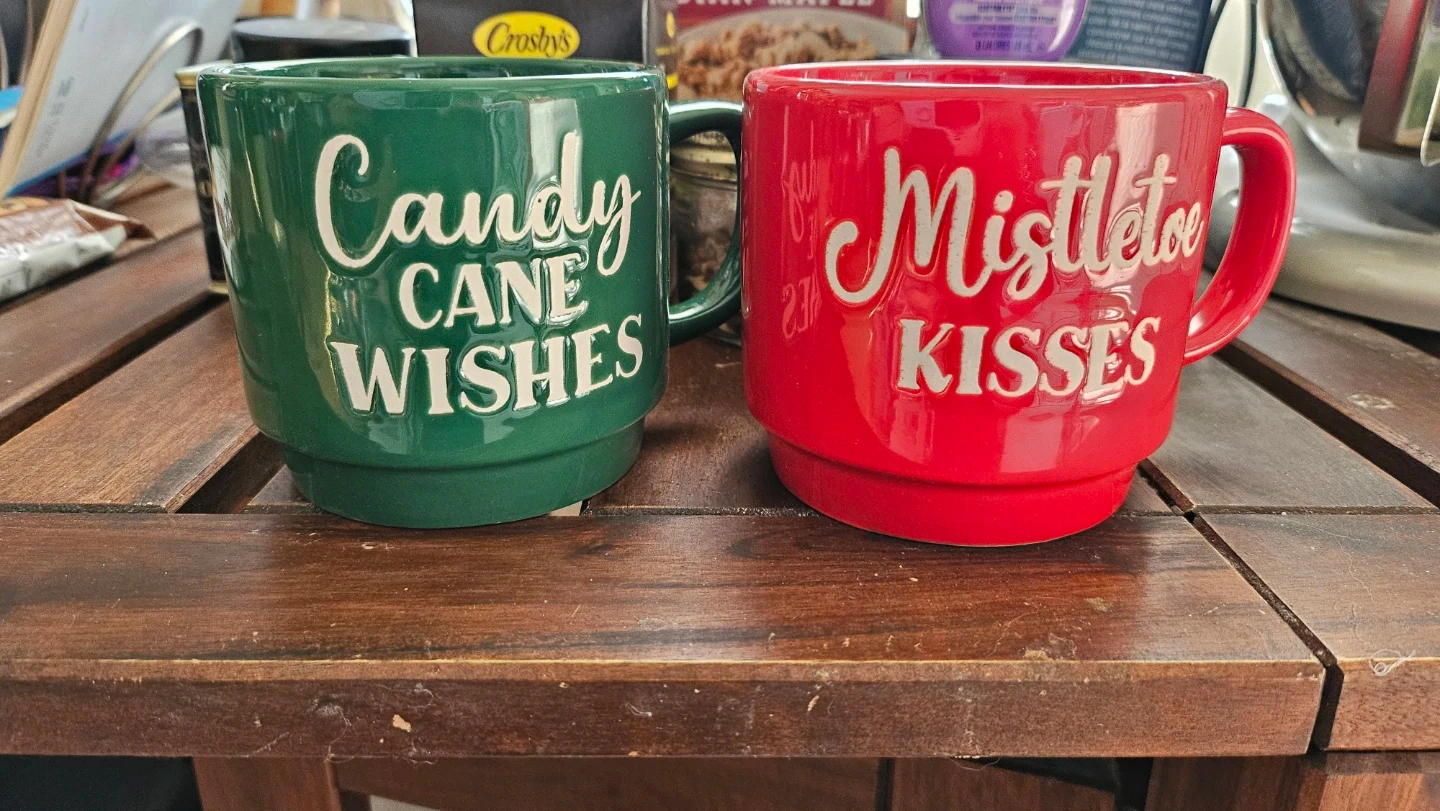 Selling a set of two festive Christmas mugs. One mug is green with "Candy Cane Wishes" and the other is red with "Mistletoe Kisses". These ceramic mugs are perfect for your holiday beverages! Makes a great gift. Both mugs for $5.