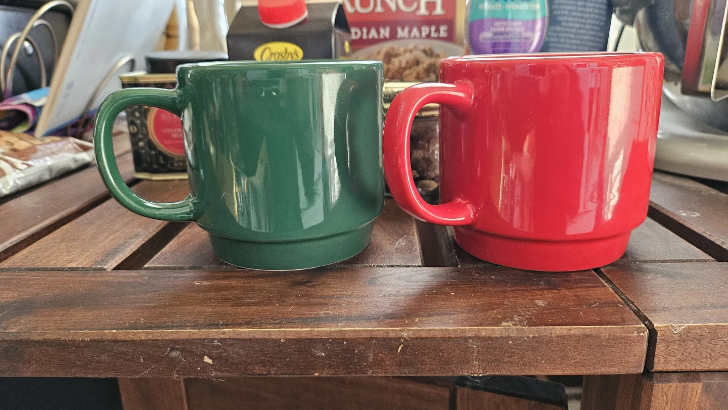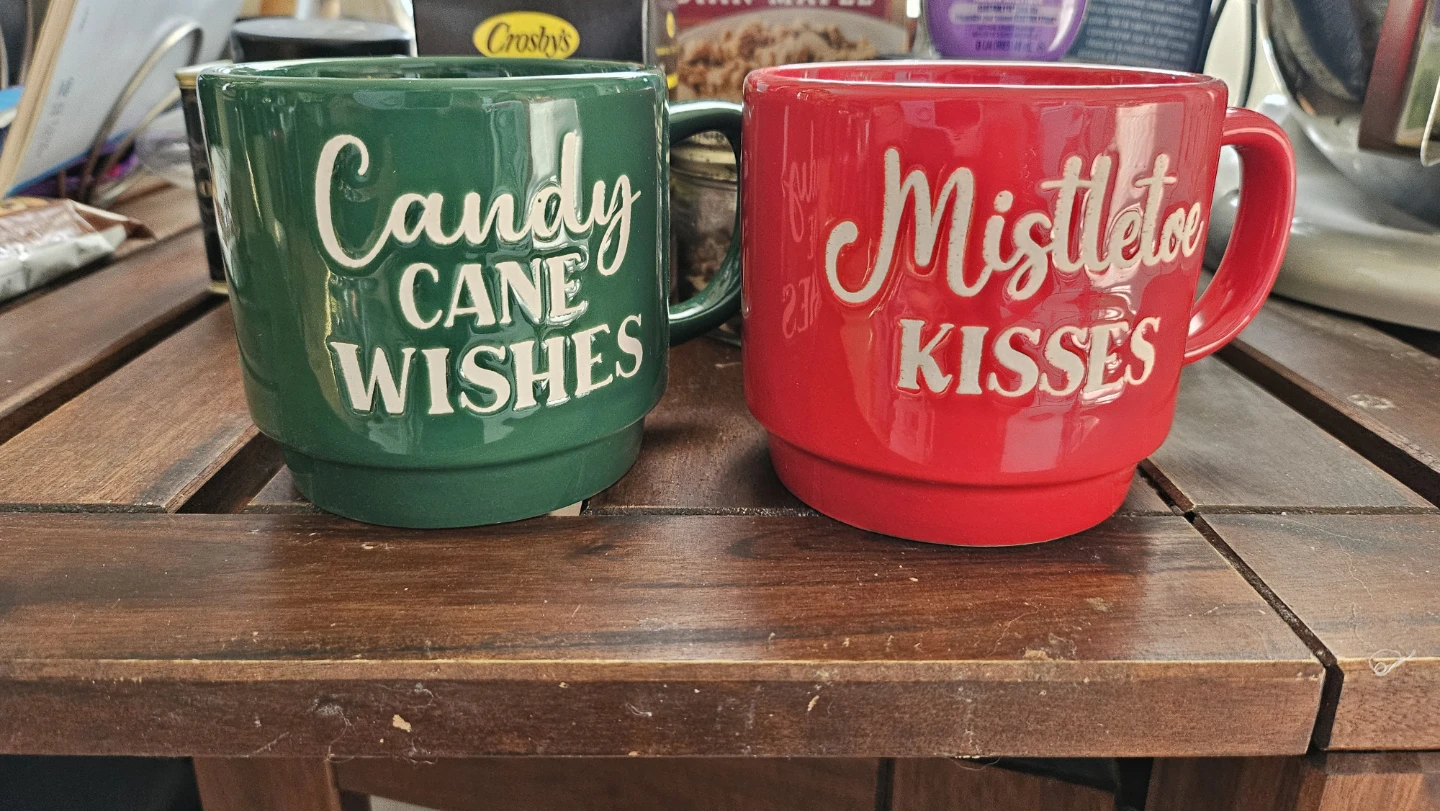 Selling a set of two festive Christmas mugs. One mug is green with "Candy Cane Wishes" and the other is red with "Mistletoe Kisses". These ceramic mugs are perfect for your holiday beverages! Makes a great gift. Both mugs for $5.