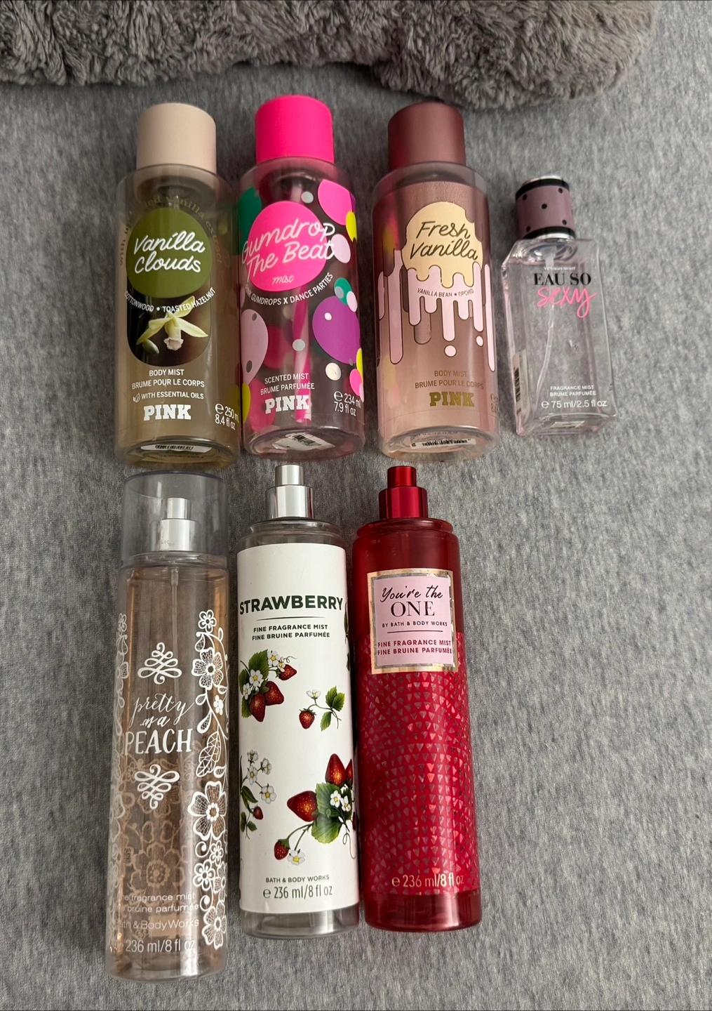 Selling a variety of used body mists and lotions from Bath & Body Works and PINK. Scents include Vanilla Clouds, Gumdrop the Beat, Fresh Vanilla, Eau So Sexy, Pretty as a Peach, Strawberry, You're the One, A Thousand Wishes, Champagne Toast, and Black Raspberry Vanilla. Great for layering scents or just keeping your skin moisturized!