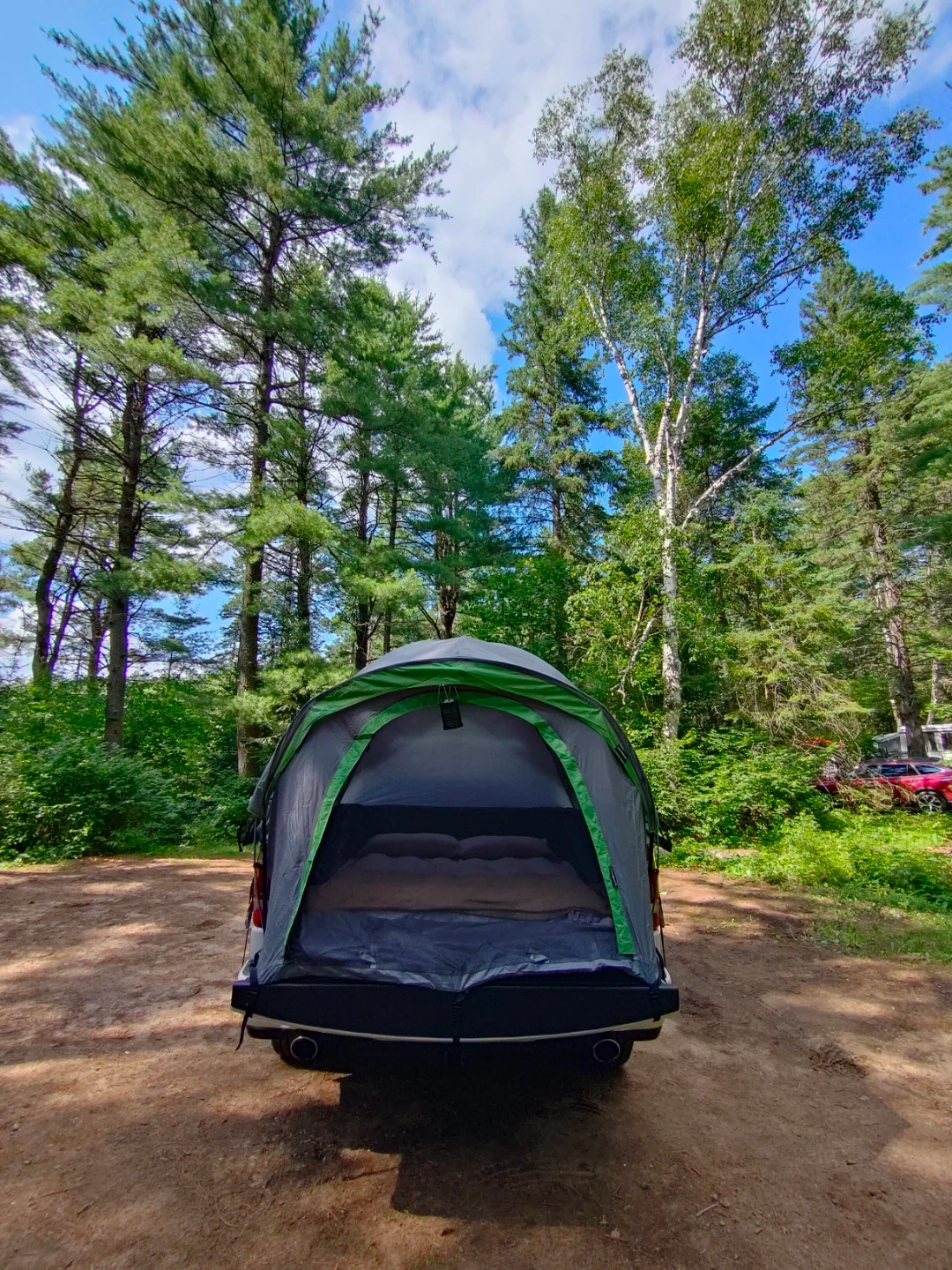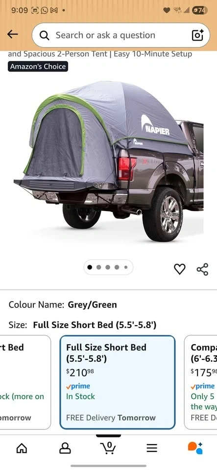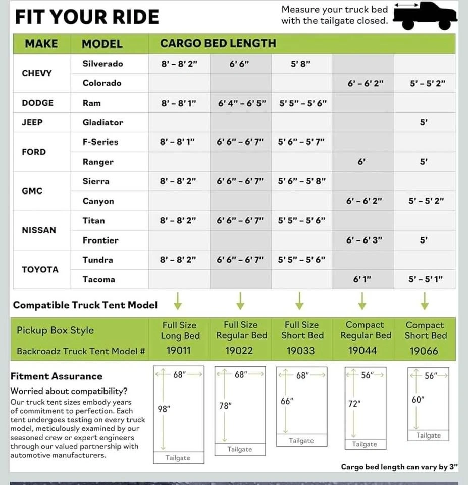 Fits Full Size Short Bed trucks (5.5'-5.8'). This tent transforms your truck bed into a comfortable campsite. Ideal for sleeping two people. It has a full rainfly, reinforced seams, storm flaps, and 9 adjustable straps for a secure fit. Made with high-quality polyester taffeta and rugged polyethylene for durability and weather resistance. Features 2 large windows and a ceiling vent for good airflow.