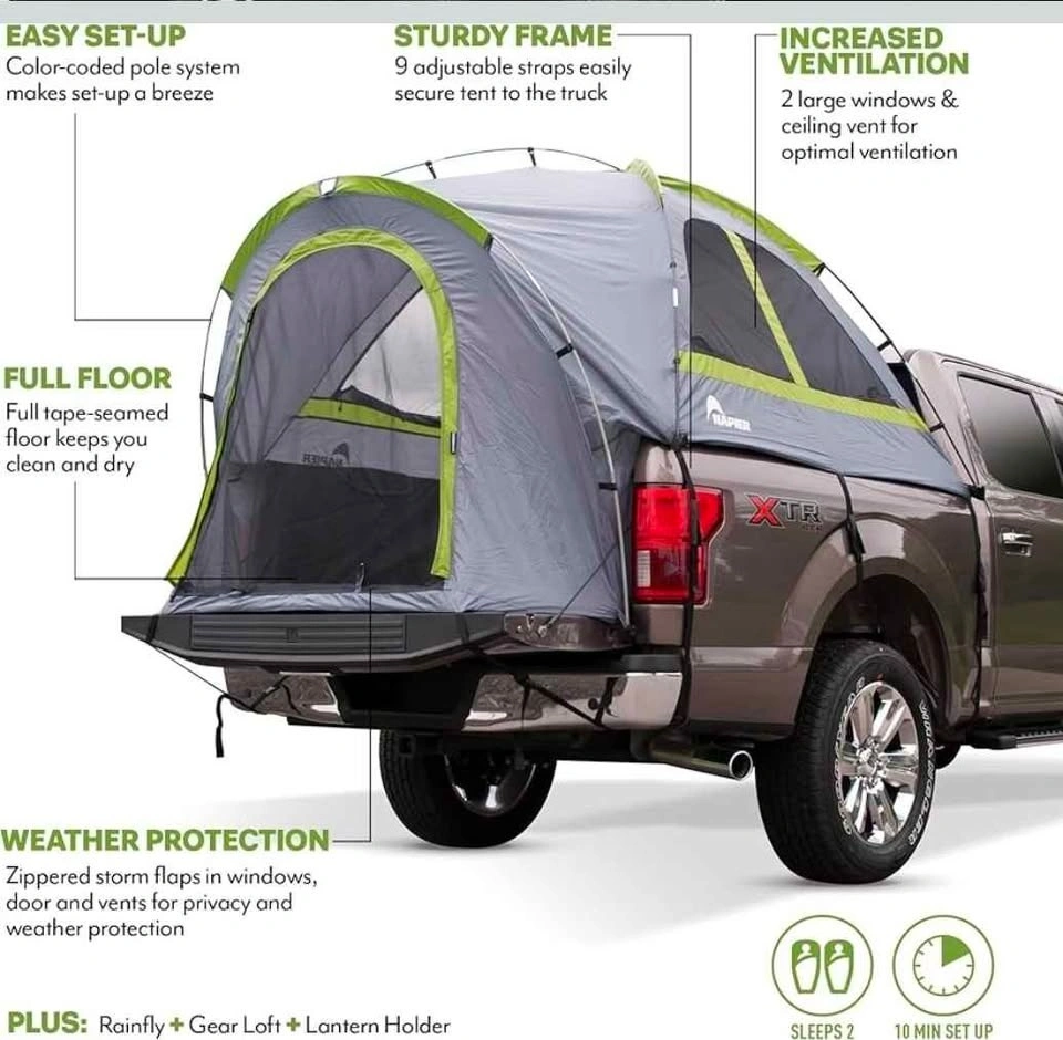 Fits Full Size Short Bed trucks (5.5'-5.8'). This tent transforms your truck bed into a comfortable campsite. Ideal for sleeping two people. It has a full rainfly, reinforced seams, storm flaps, and 9 adjustable straps for a secure fit. Made with high-quality polyester taffeta and rugged polyethylene for durability and weather resistance. Features 2 large windows and a ceiling vent for good airflow.