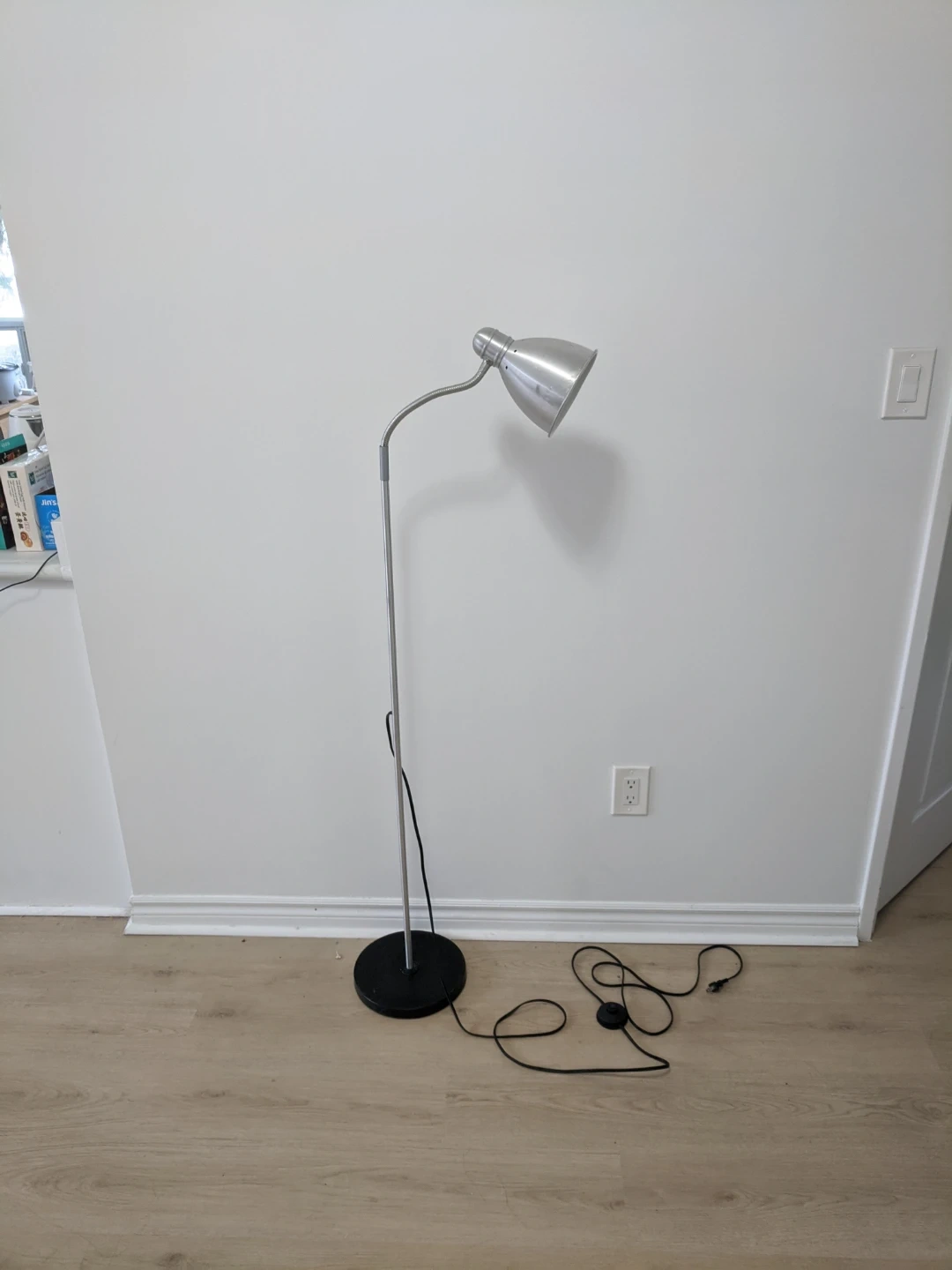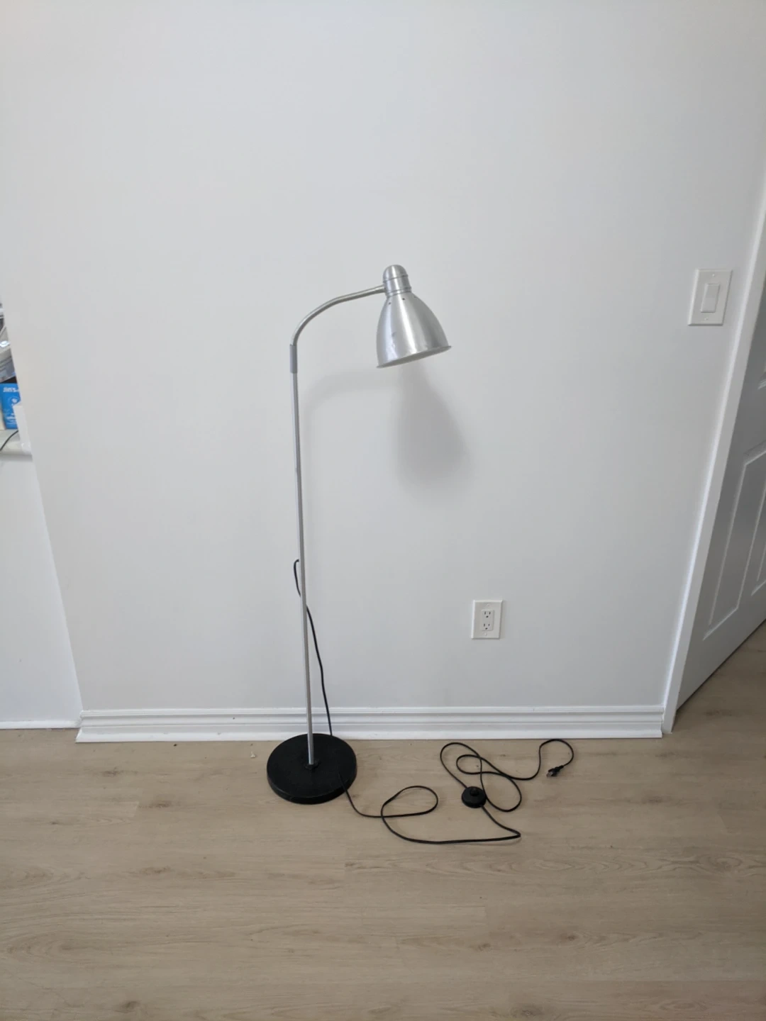 This is a silver, adjustable floor lamp with a black base. It features a flexible gooseneck for directing light. It has a foot pedal switch for easy operation. Great for reading or task lighting!