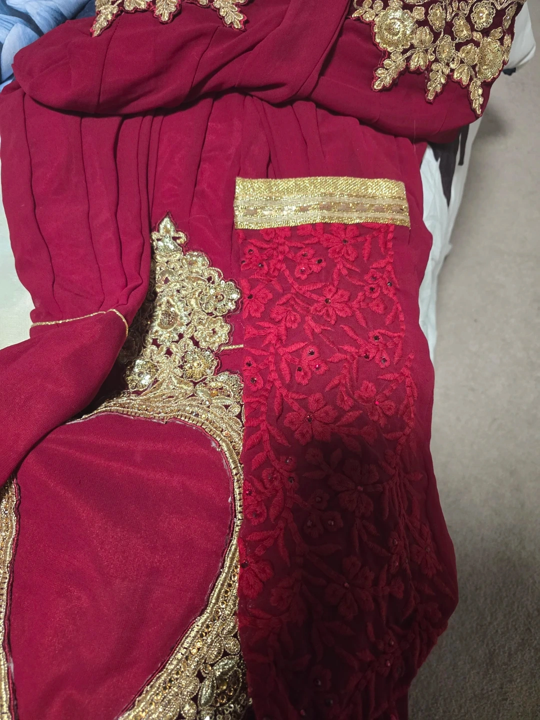This is a beautiful red women's suit with intricate gold embroidery. It features detailed floral patterns on the sleeves and neckline. The fabric looks rich and is perfect for special occasions. This outfit would be stunning for any festive event or wedding!