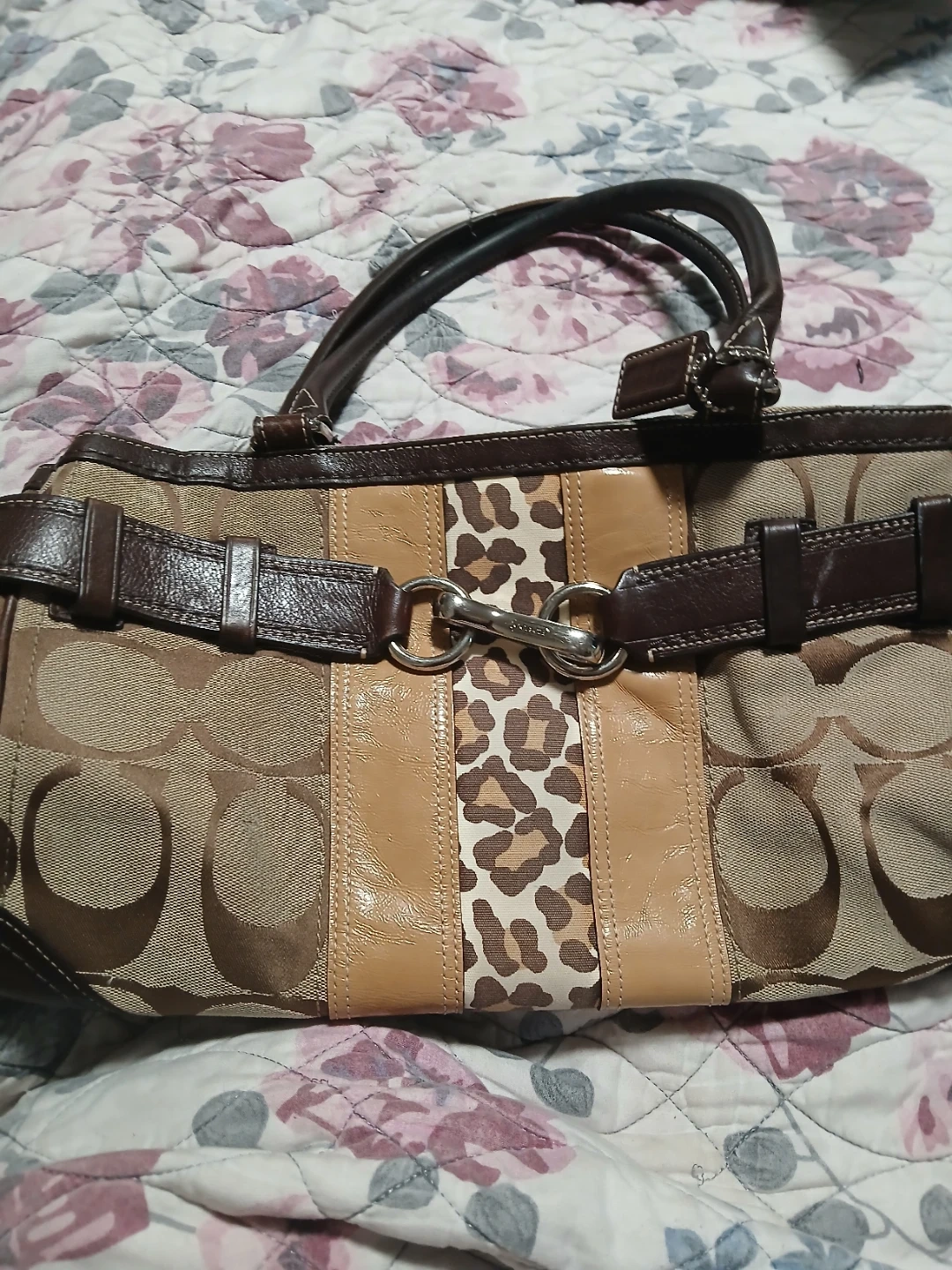 This is a Coach bag featuring the signature monogram pattern with brown leather trim and a leopard print accent panel. It has dual top handles and silver-toned hardware. This spacious tote is great for everyday use! Price is firm plz. Pick up midland and Danforth or 401 bay street or stc mall or Kennedy stn