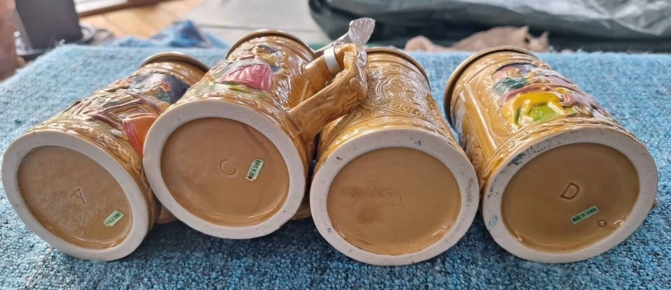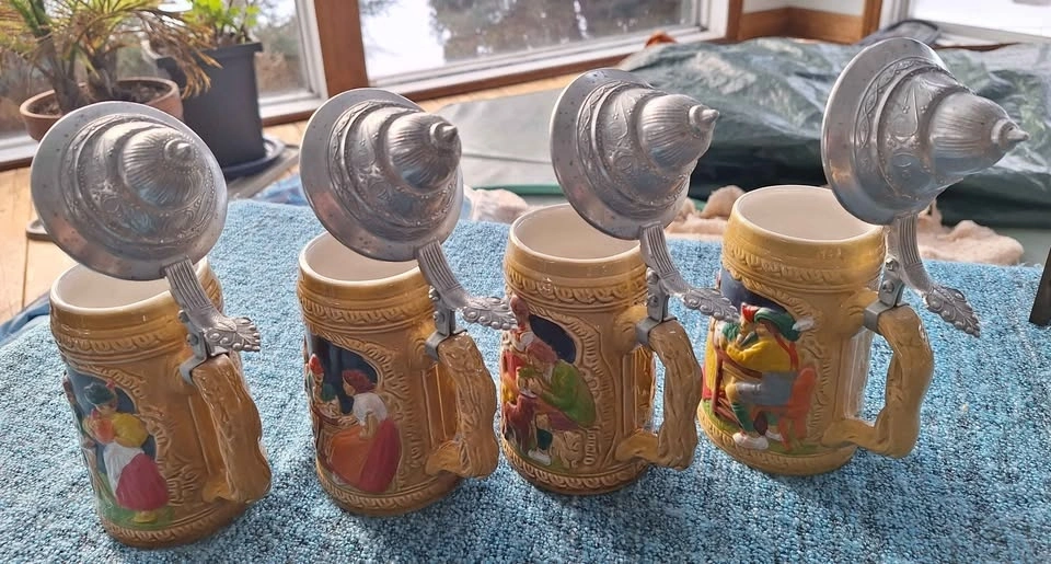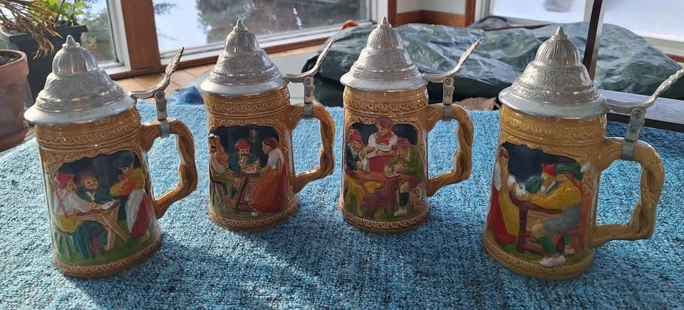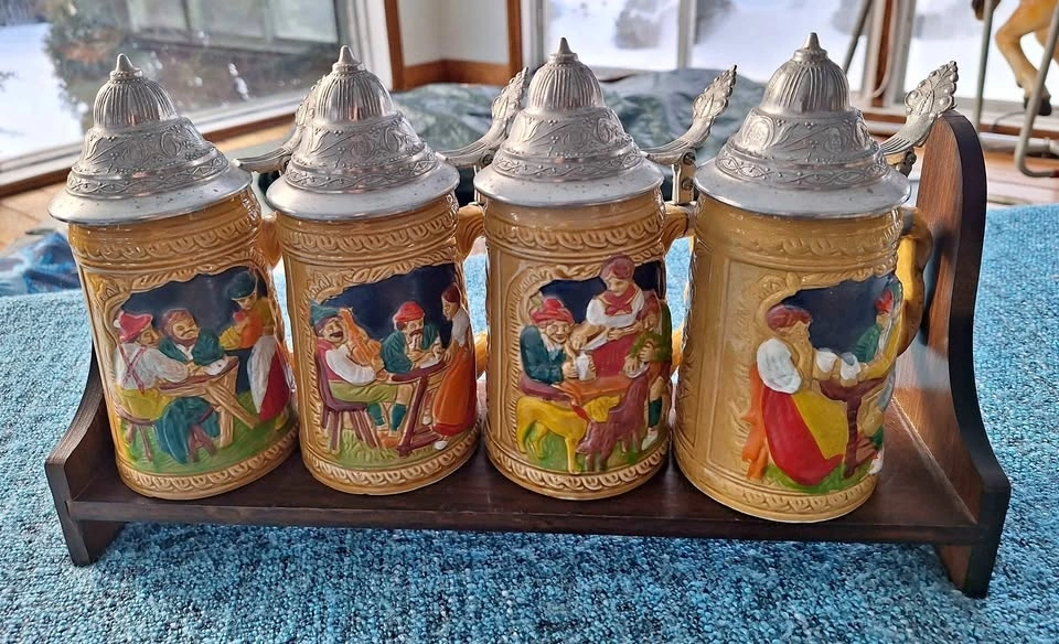 Set of 4 vintage 7" ceramic German style beer steins with wall mount shelf. Made in Taiwan, no chips cracks or scratches, displayed only and never used. Pick up is Bloomington and 9th line area.
