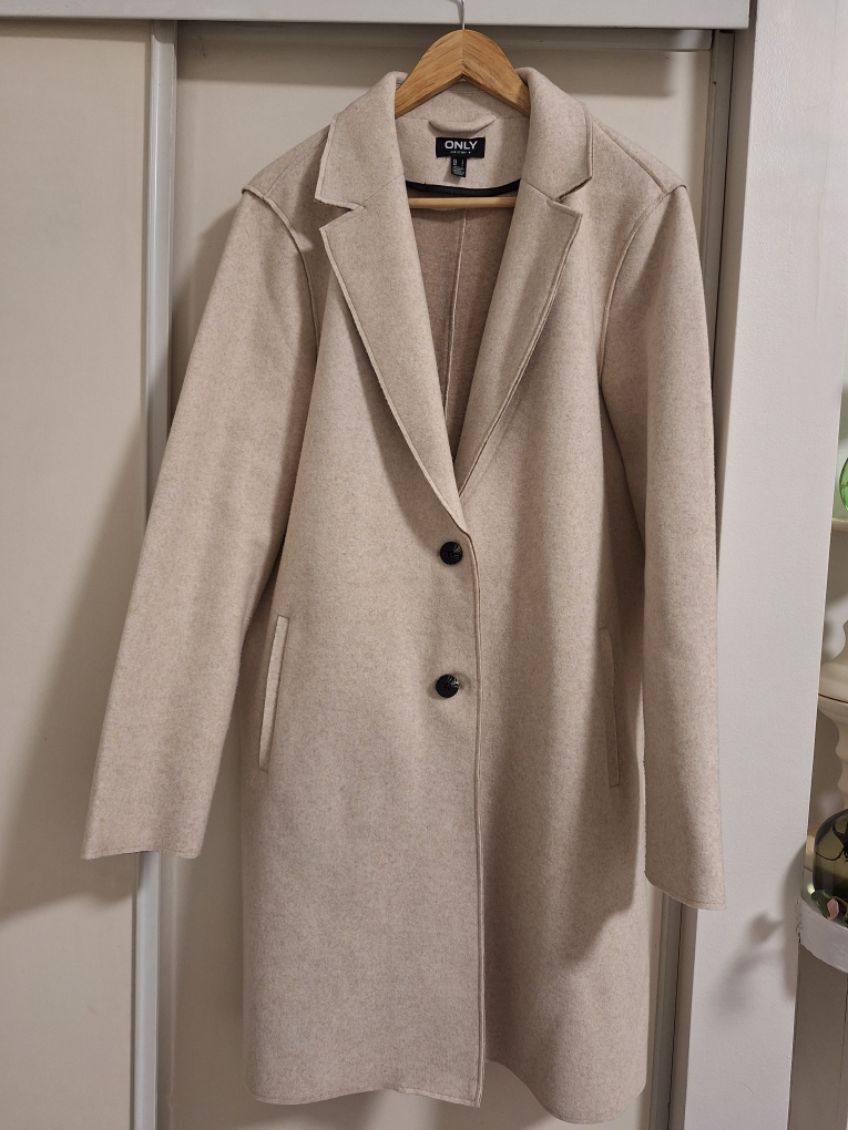 Long, beige coat with a collar and three buttons. The coat is made of a soft fabric. fits size M/L. Barley worn. pick up in Toronto in Roncesvalles