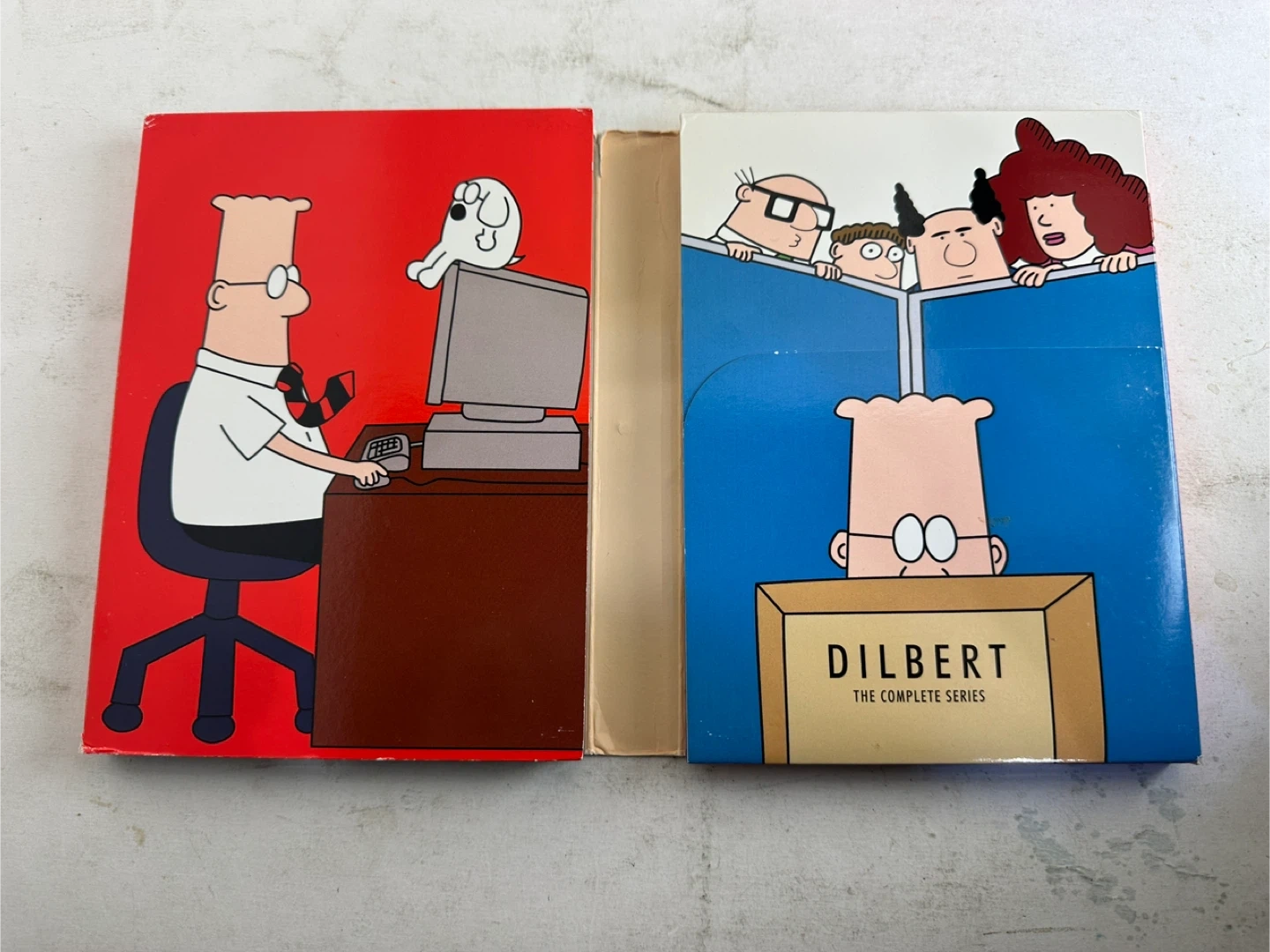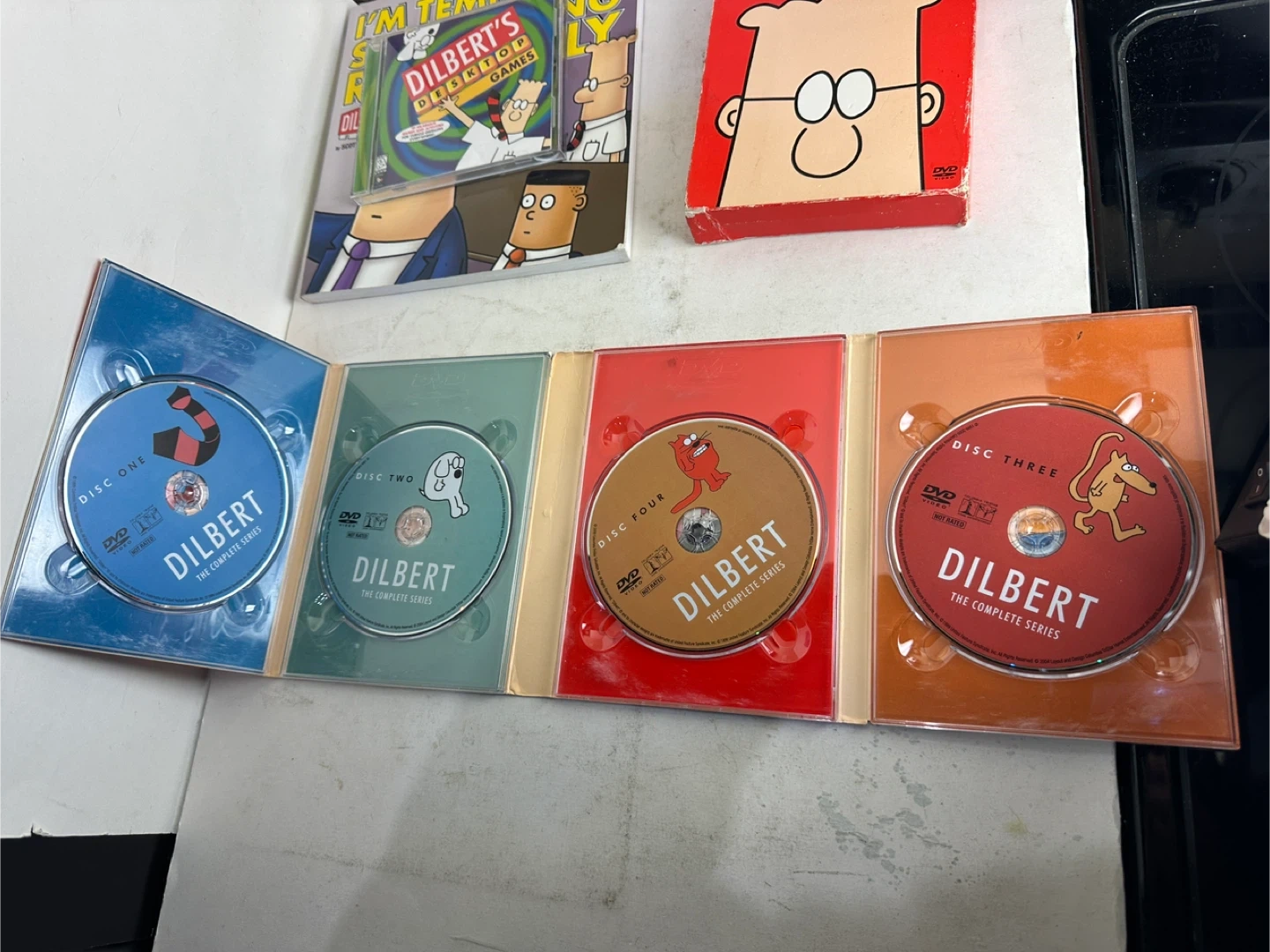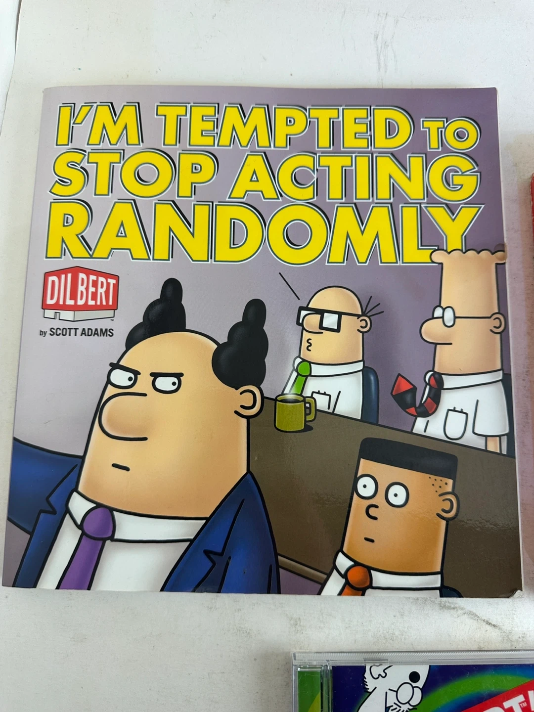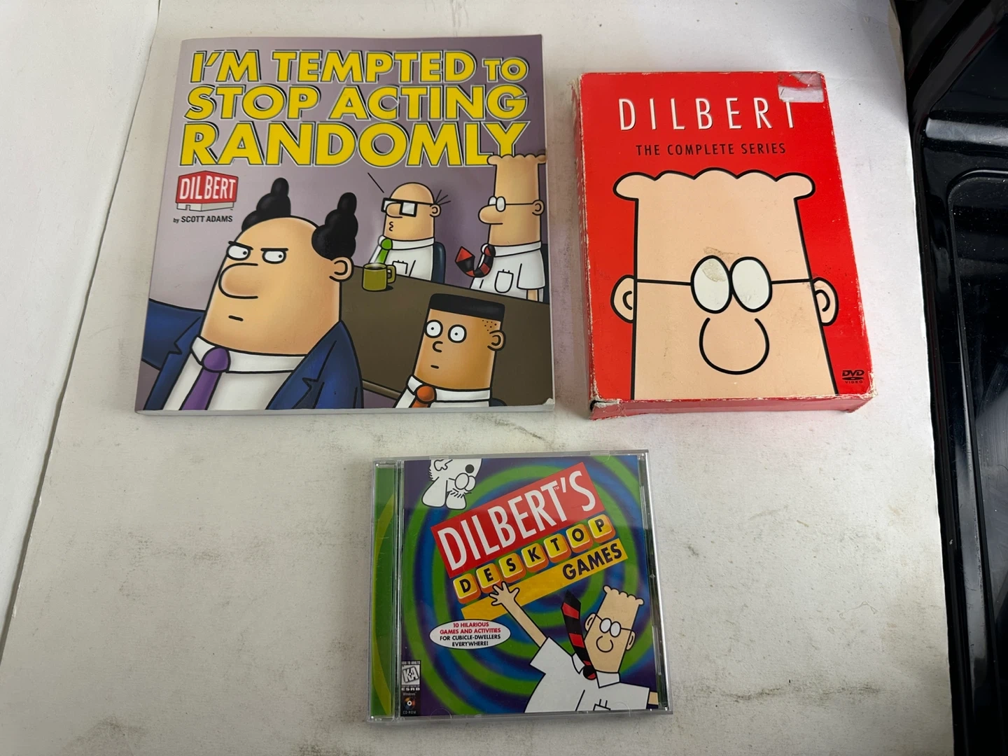 This lot includes the Dilbert book "I'm Tempted to Stop Acting Randomly" by Scott Adams and "Dilbert: The Complete Series" DVD set. Also included is "Dilbert's Desktop Games" CD-ROM. Great for any Dilbert fan!