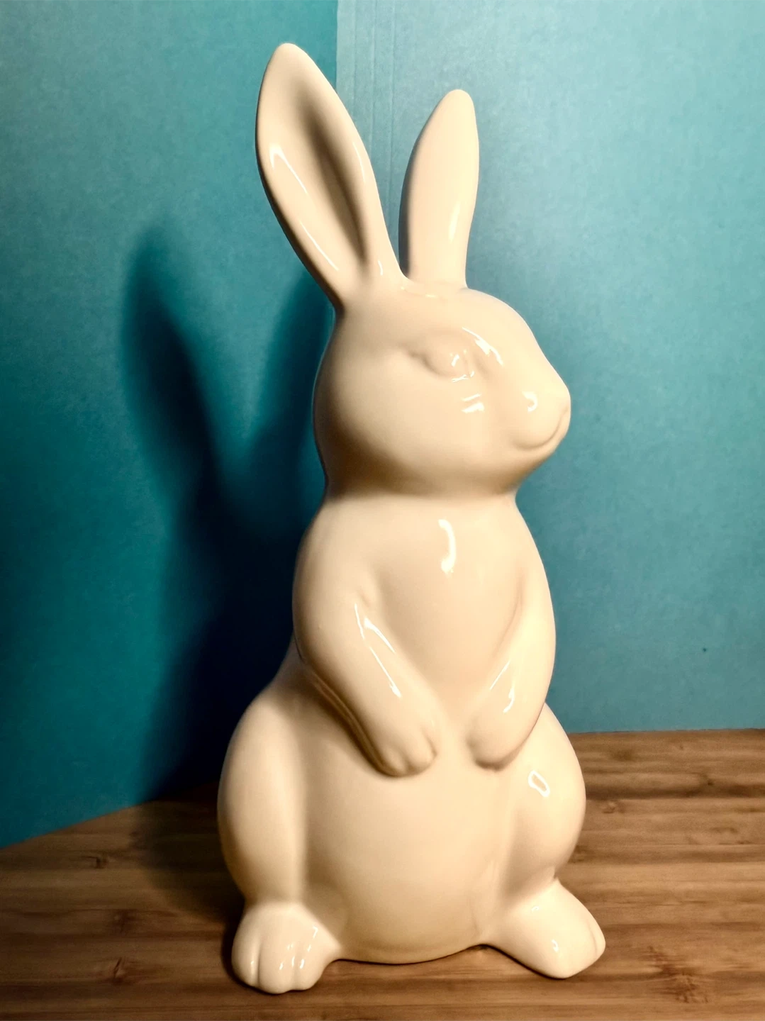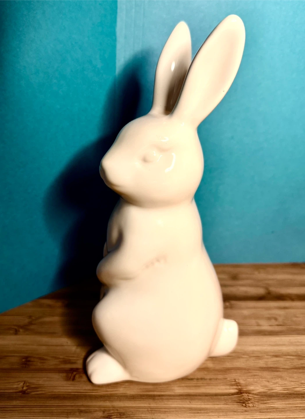 Here's a charming ceramic bunny decoration! It stands approximately 8 inches tall, making it a sweet addition to any space. It's in great condition and ready to hop into a new home