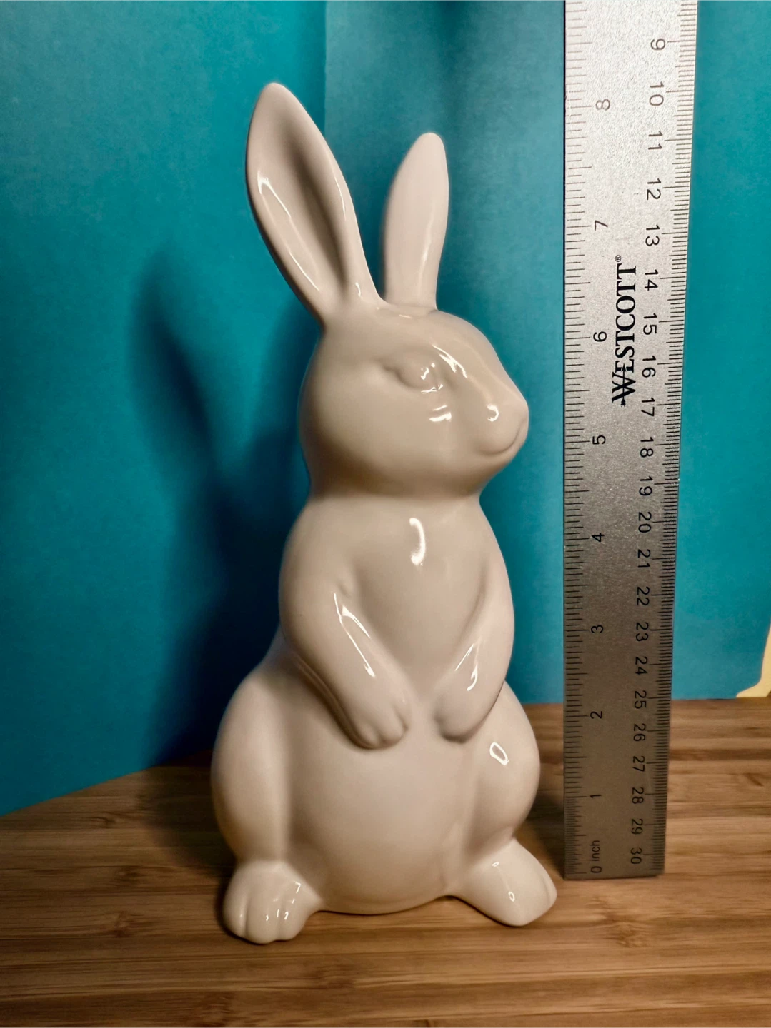 Here's a charming ceramic bunny decoration! It stands approximately 8 inches tall, making it a sweet addition to any space. It's in great condition and ready to hop into a new home
