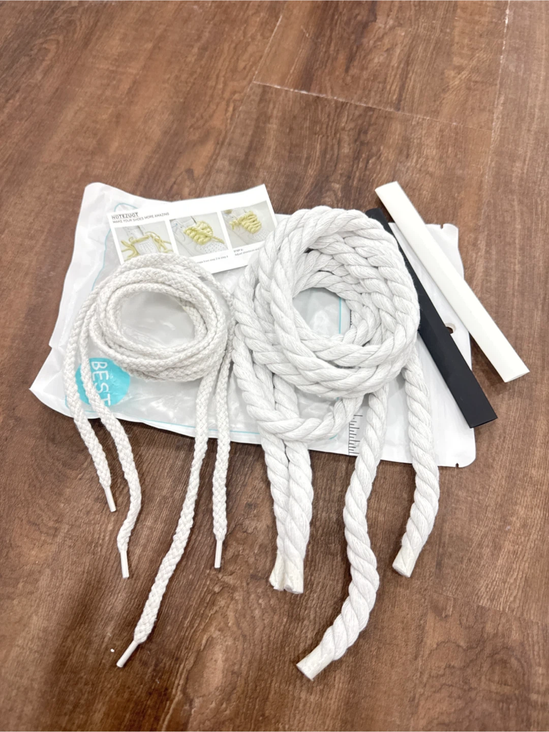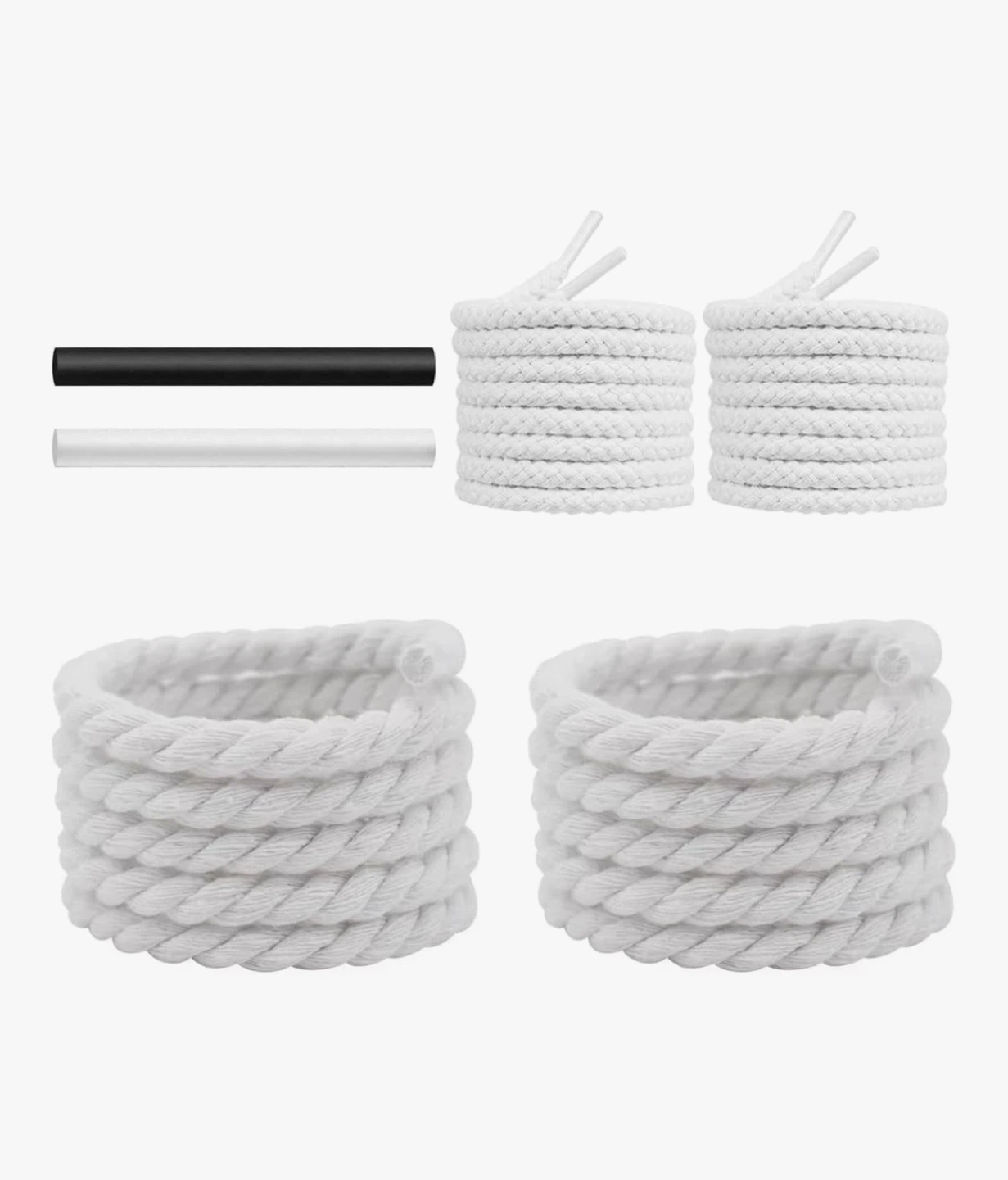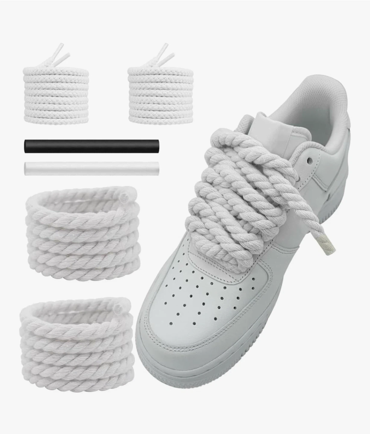 These are thick, braided rope shoelaces by NDTEZUGT. They come in white with two black and white aglets. They're great for customizing sneakers or replacing worn-out laces!