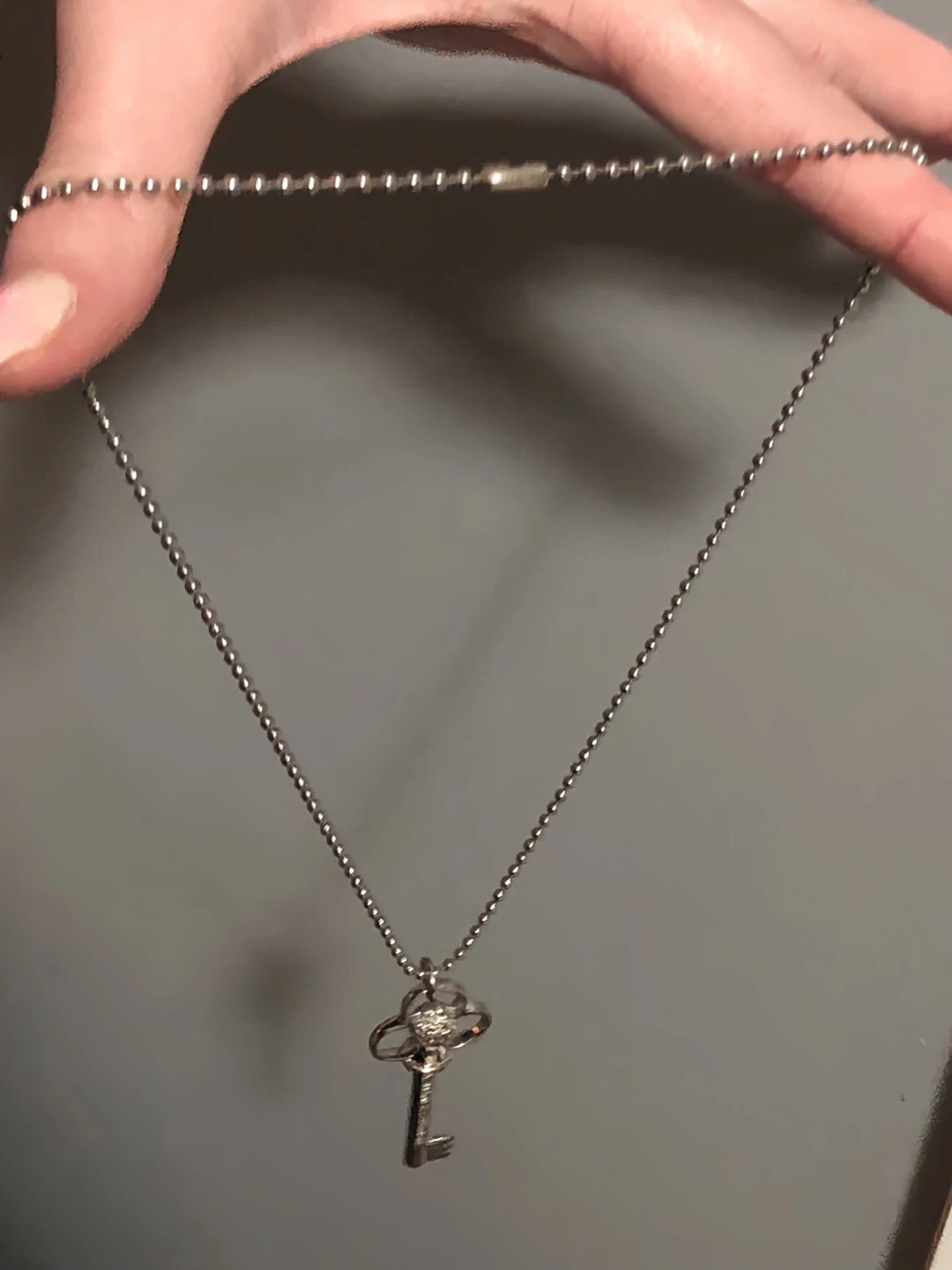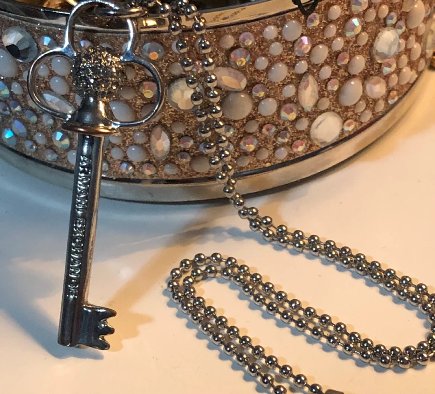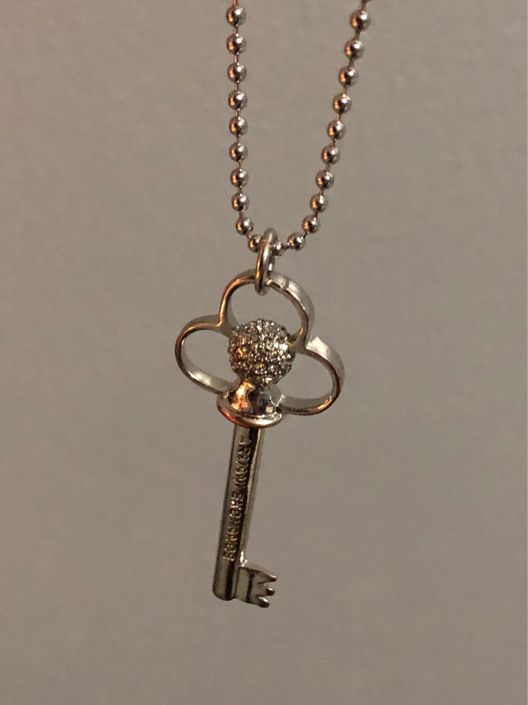 This Armani Exchange necklace features a silver-tone key pendant. It has a delicate ball chain. Perfect for adding a touch of elegance to any outfit!
