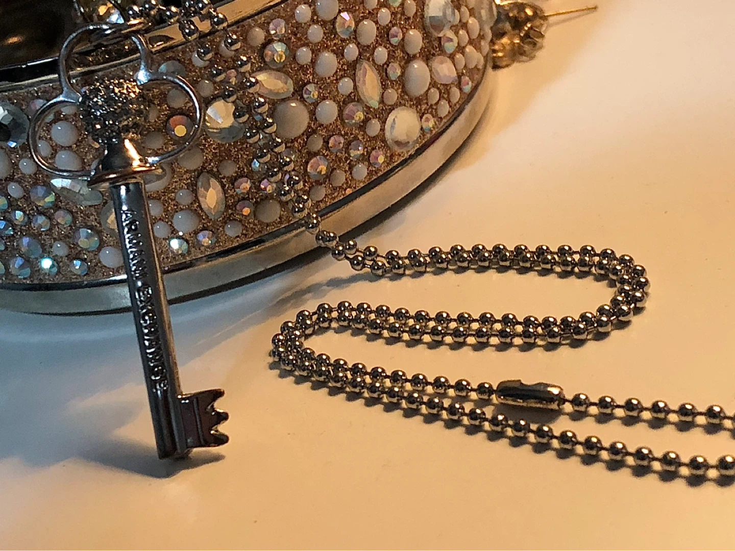This Armani Exchange necklace features a silver-tone key pendant. It has a delicate ball chain. Perfect for adding a touch of elegance to any outfit!