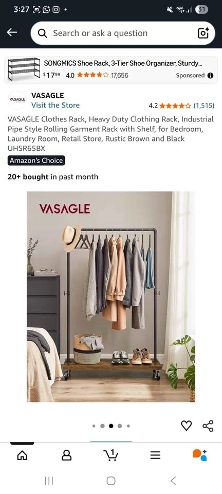 Heavy-duty VASAGLE rolling garment rack. Industrial pipe style with rustic brown shelf and black metal frame. Has wheels. Top rail holds up to 66 lb, bottom shelf 110 lb. Use for clothes, plants, or extra storage. Measures approx 63.8" H x 41.1" W x 15.7" D.