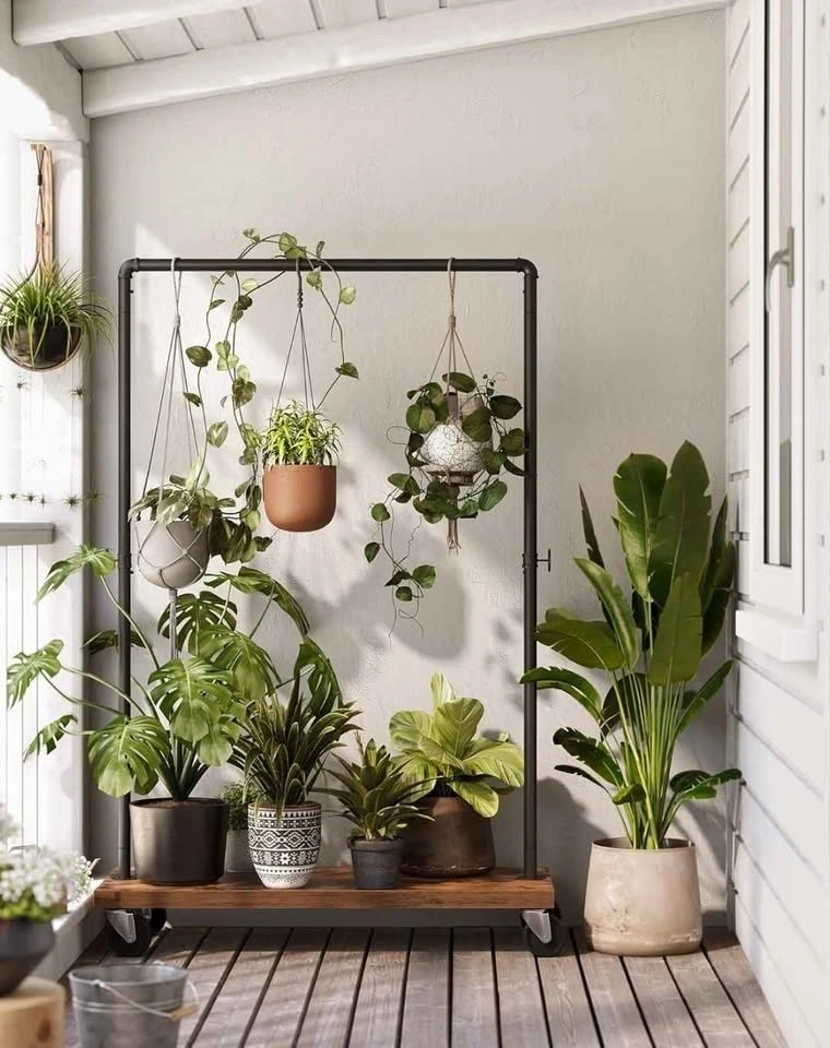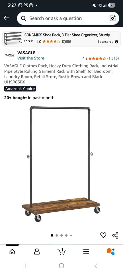 Heavy-duty VASAGLE rolling garment rack. Industrial pipe style with rustic brown shelf and black metal frame. Has wheels. Top rail holds up to 66 lb, bottom shelf 110 lb. Use for clothes, plants, or extra storage. Measures approx 63.8" H x 41.1" W x 15.7" D.