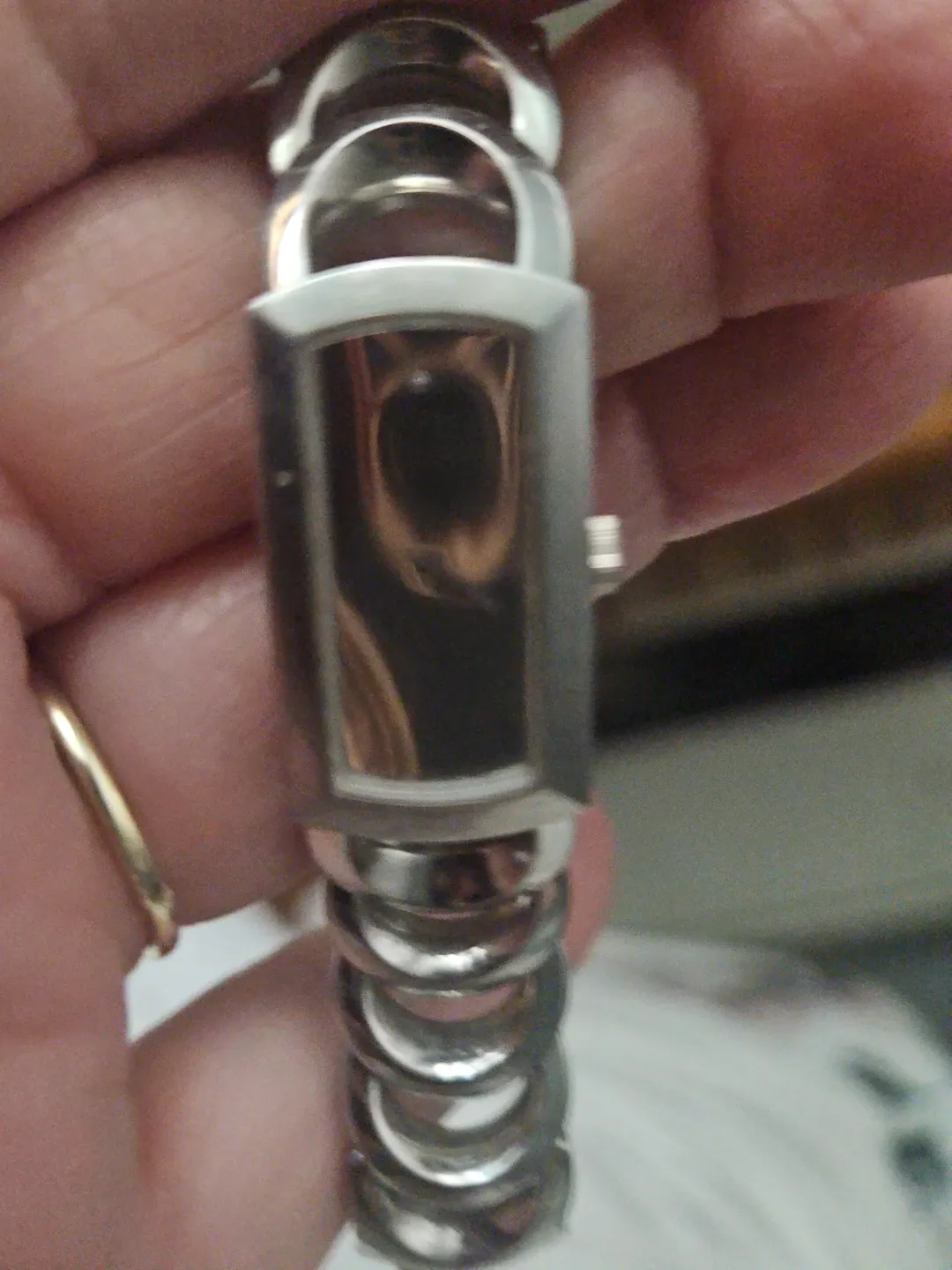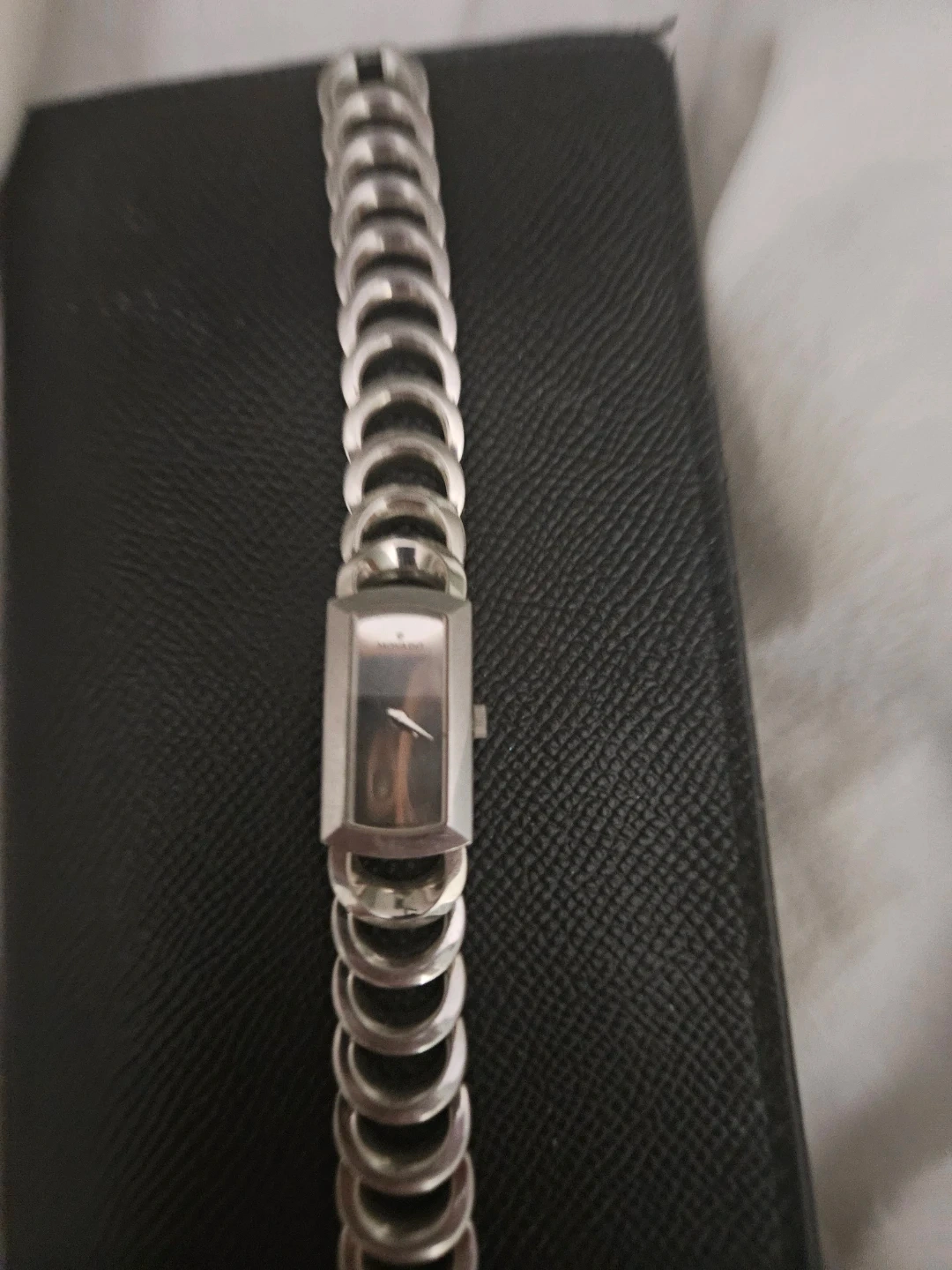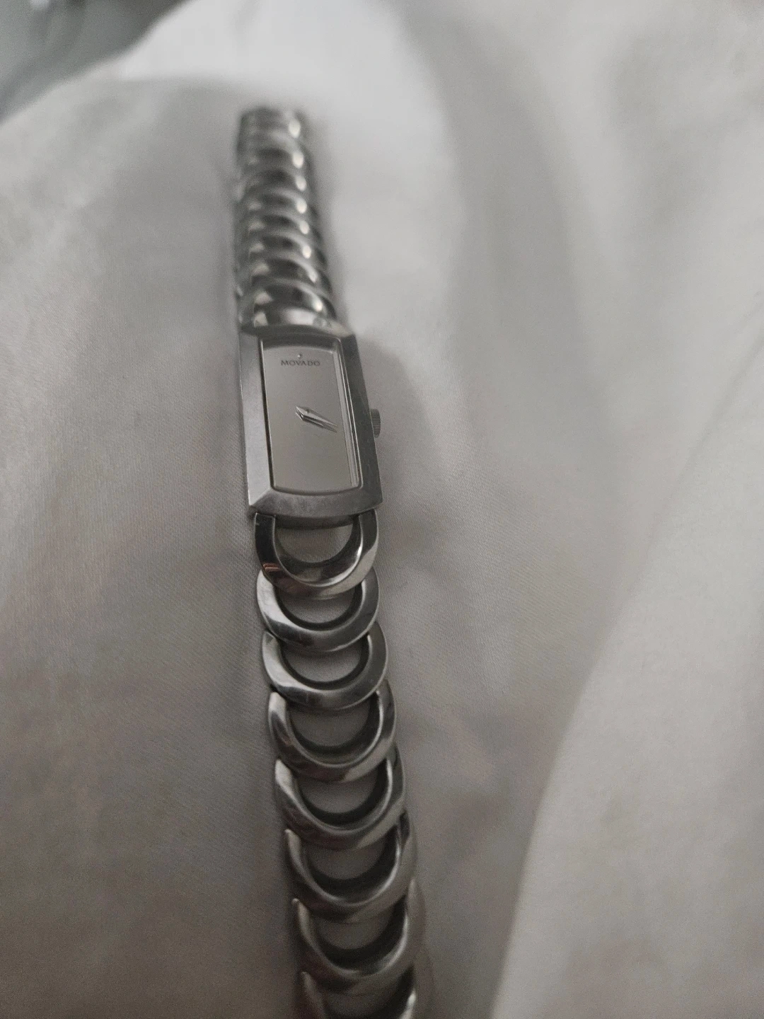 This is a stylish Movado ladies watch with a silver-tone metal band. It features a rectangular face and a durable metal construction. It's a classic timepiece for everyday wear.