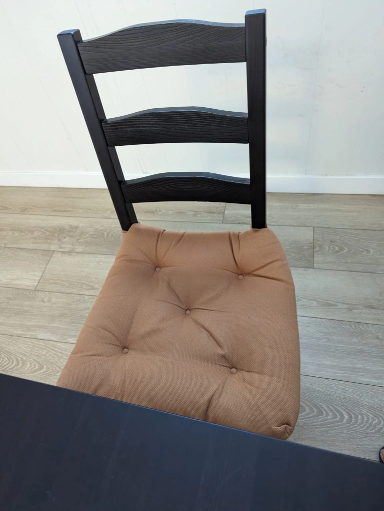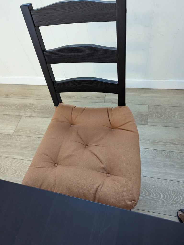 Dining table, with 4 chairs and sitting cushion.