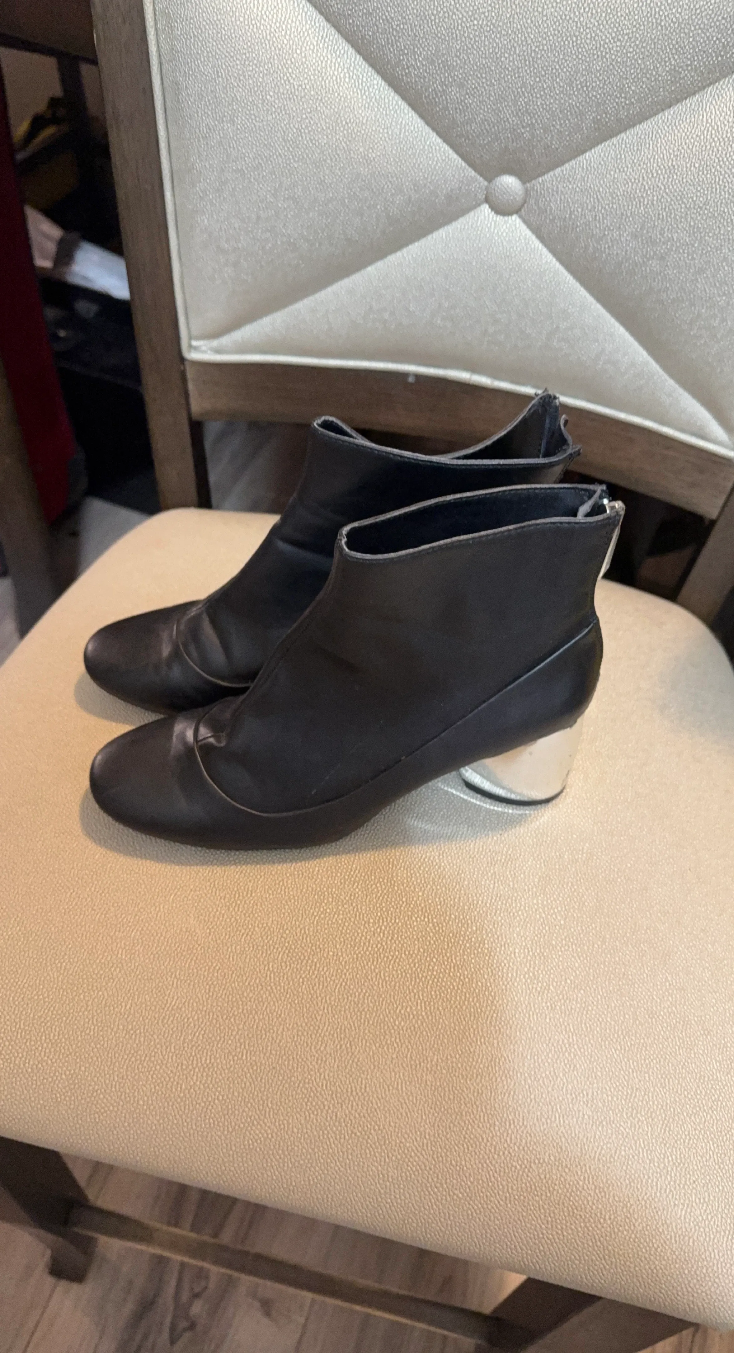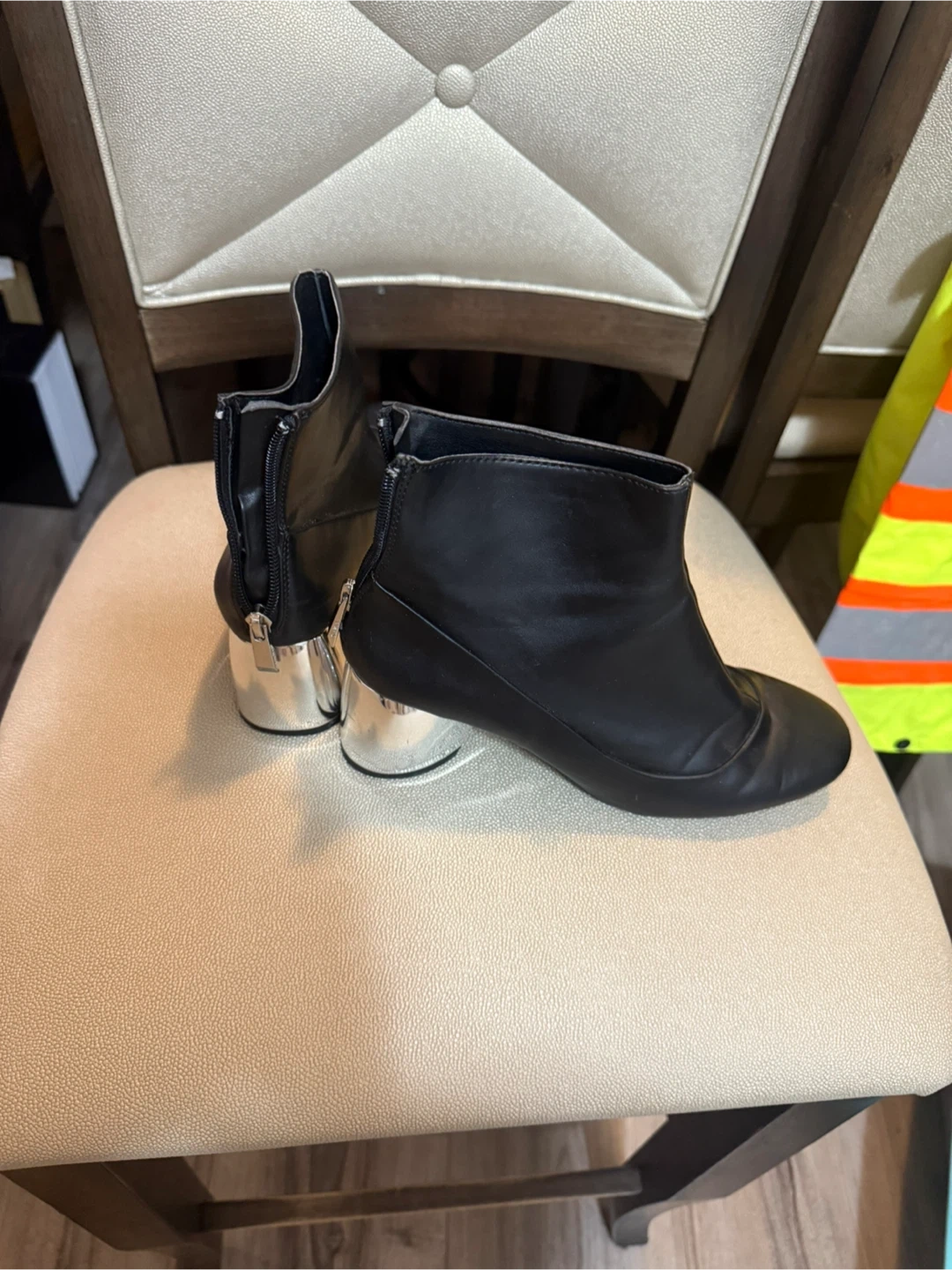 These ZARA ankle boots are black with a shiny silver block heel. They feature a zip closure at the back for easy wear. Material appears to be leather.