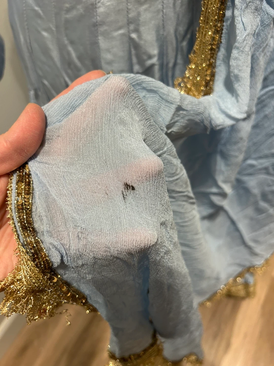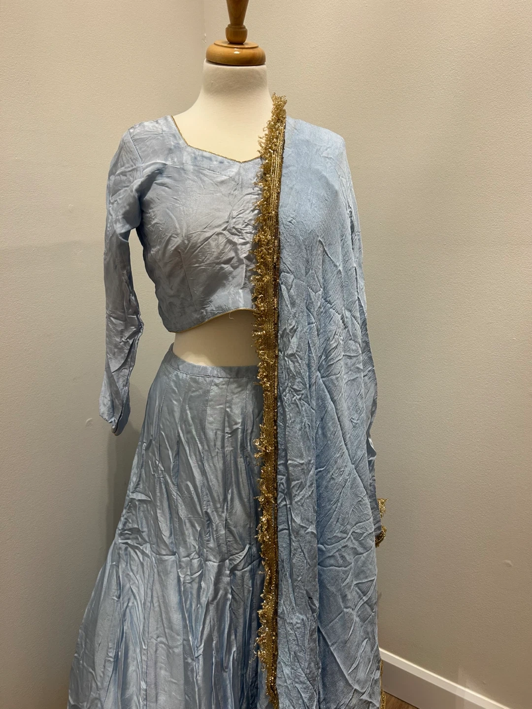 A light blue Pakistani outfit including a top, skirt, and dupatta. The garments are adorned with gold trim and embellishments. There's a small dark stain on the dupatta. This outfit would be suitable for cultural events or parties.