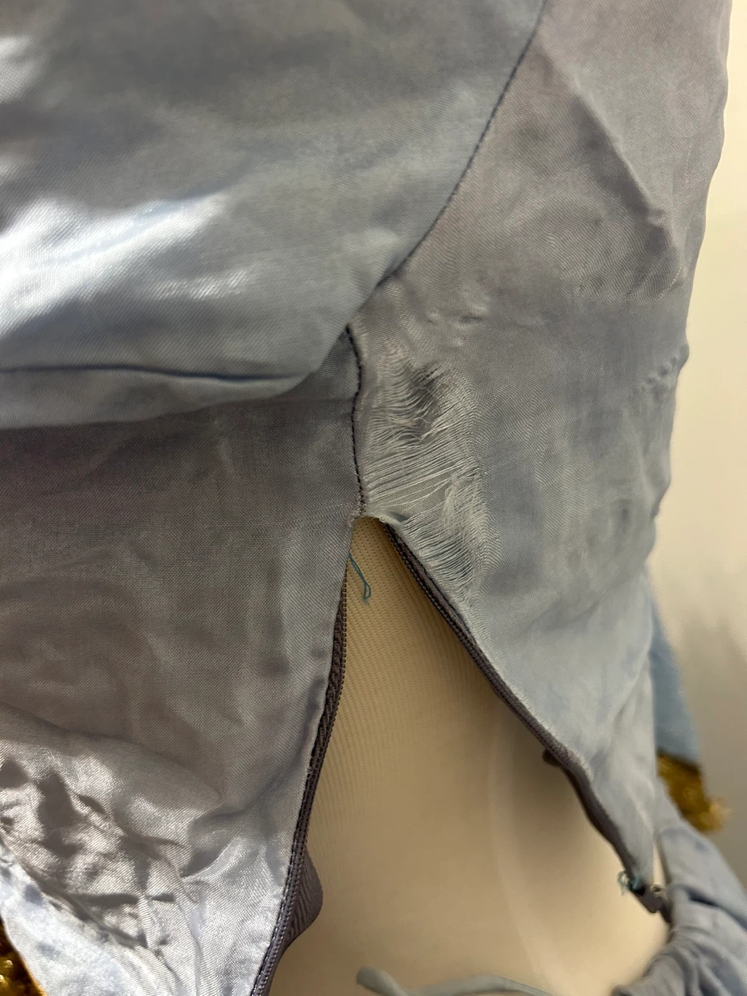 A light blue Pakistani outfit including a top, skirt, and dupatta. The garments are adorned with gold trim and embellishments. There's a small dark stain on the dupatta. This outfit would be suitable for cultural events or parties.