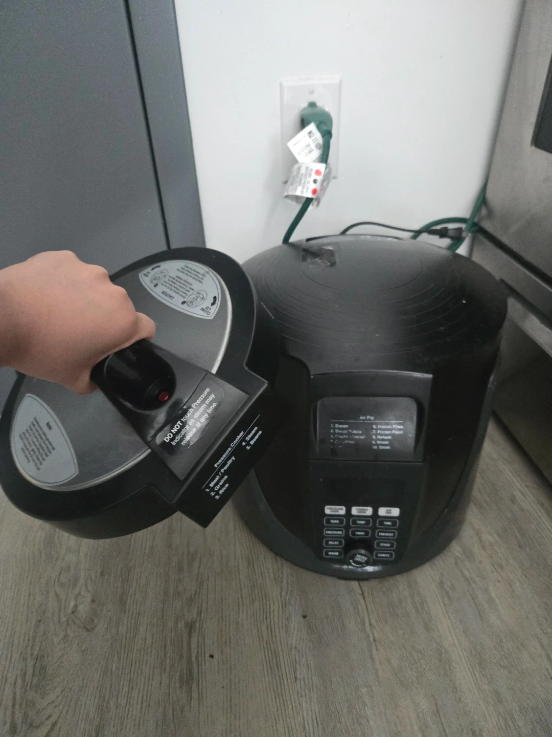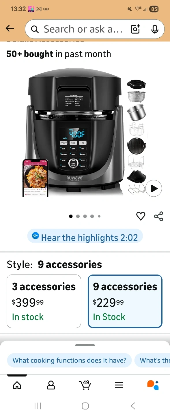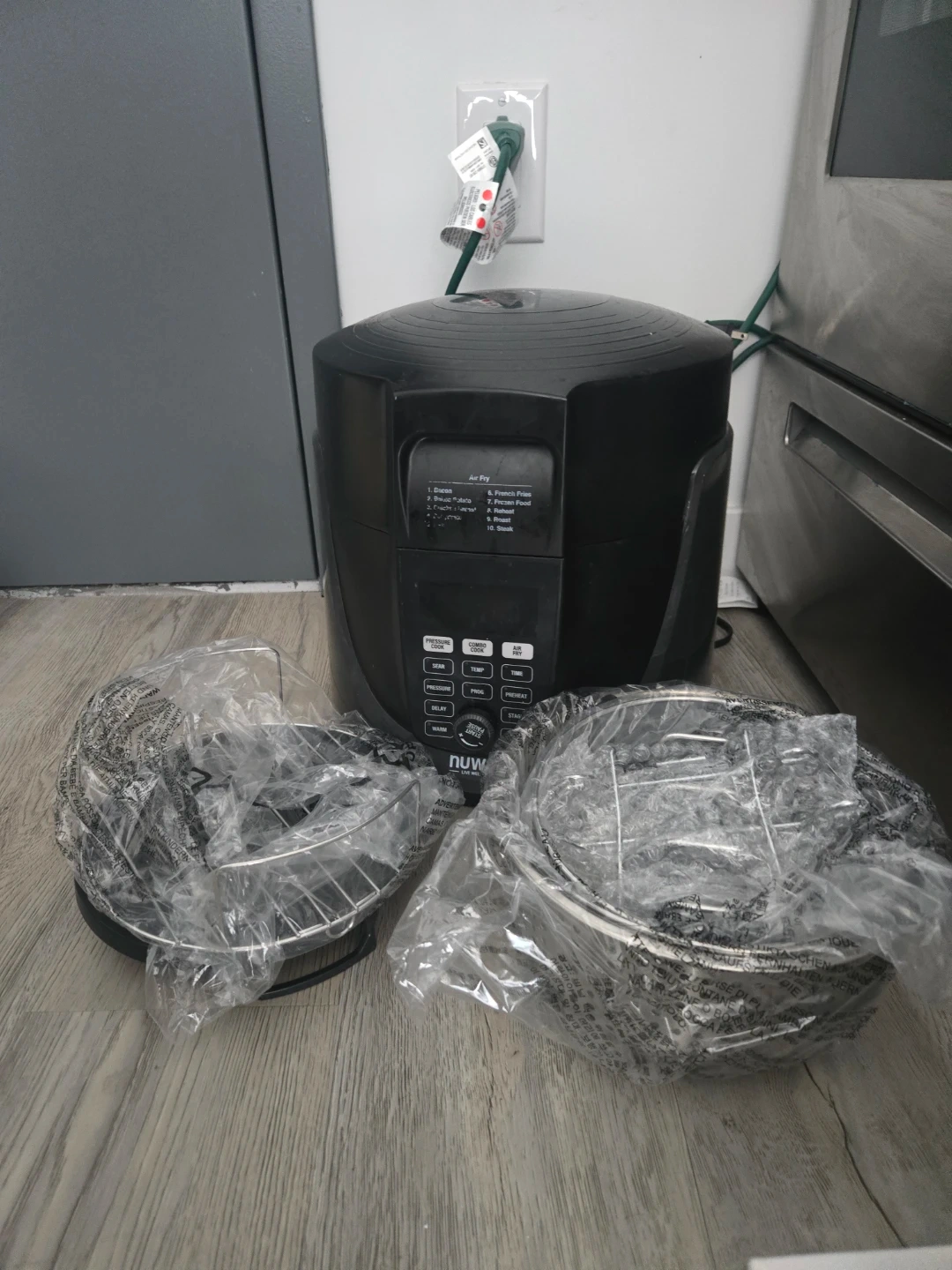 This is a Nuwave air fryer and pressure cooker combo. It comes with multiple accessories including racks and a basket. It's black and has a digital display with various cooking presets.
