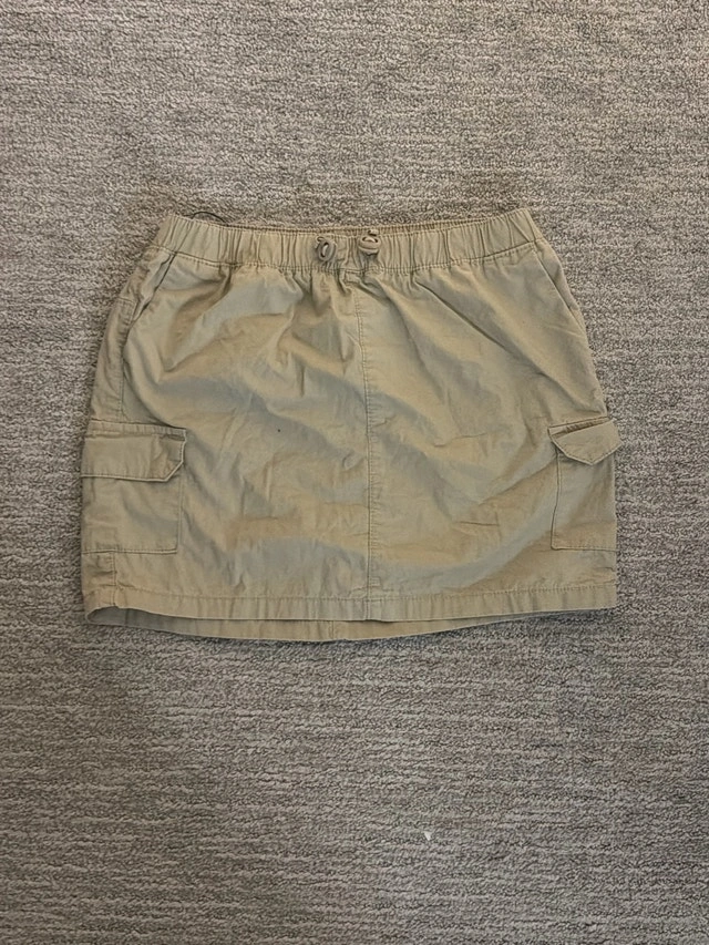 This is a classic, used cargo skirt, perfect for casual wear. It features a comfortable elastic waistband with a drawstring and functional cargo pockets. It's in good condition and ready for a new home! If the ad is up, the skirt is available!