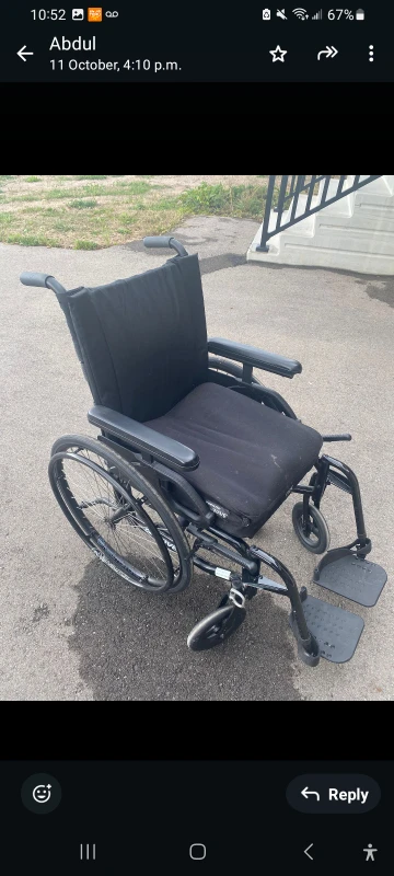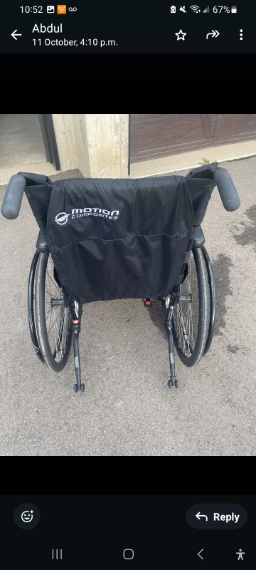 Selling a Motion Composites wheelchair in good condition. It's black and looks to be well-maintained. Perfect for someone in need of mobility assistance