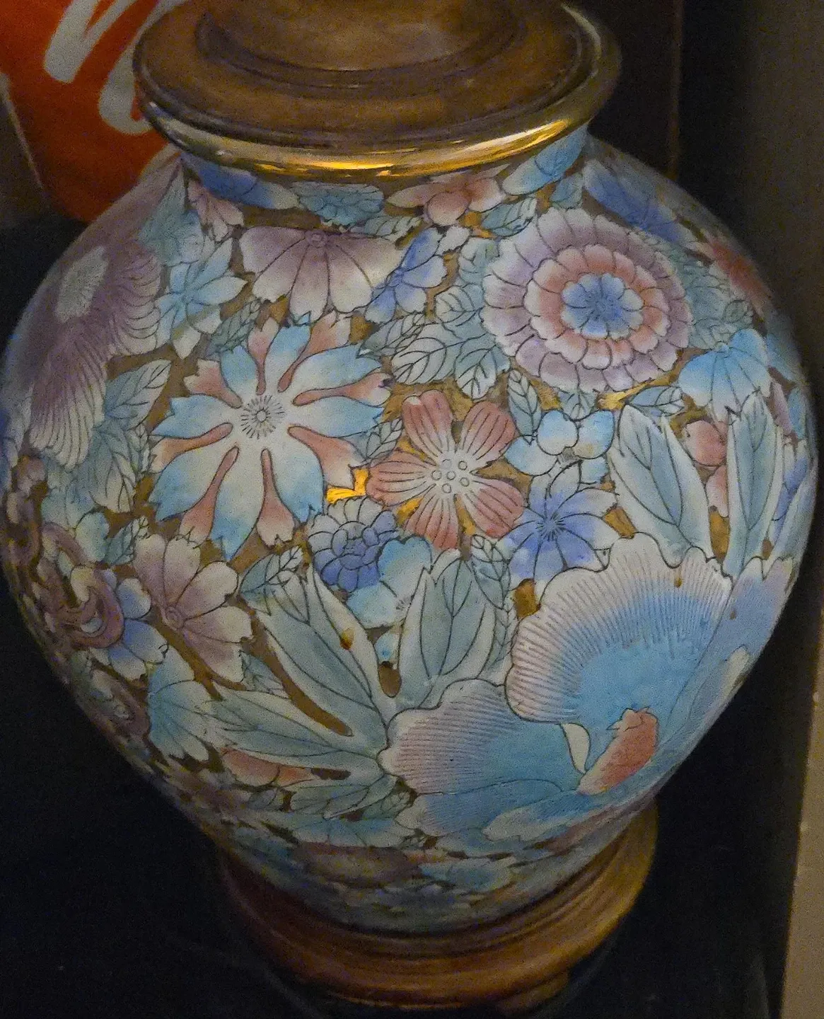 This vase features a colourful floral design in shades of blue, pink, and purple. It has a brass-coloured lid and base. Ceramic material. It is a
