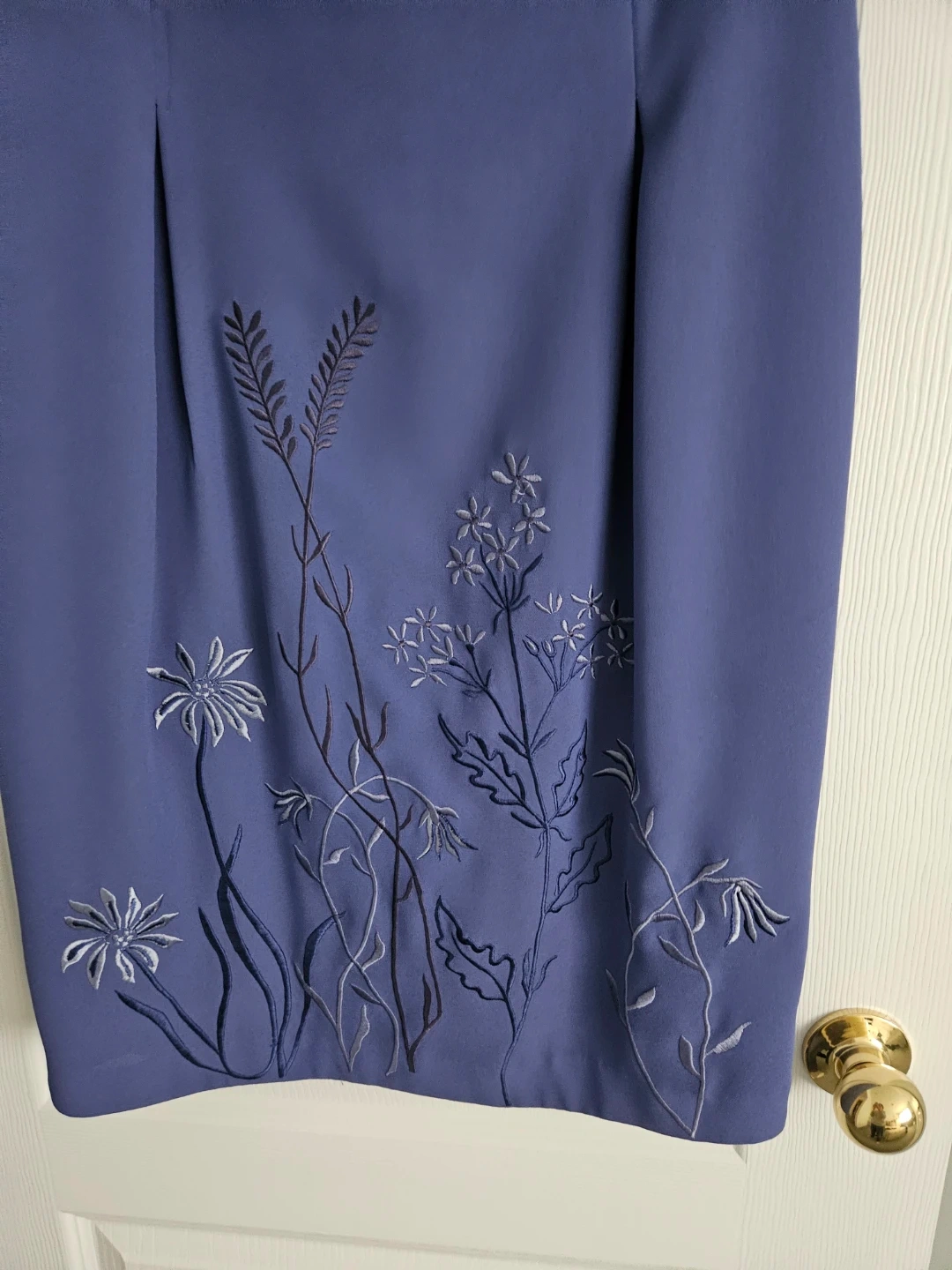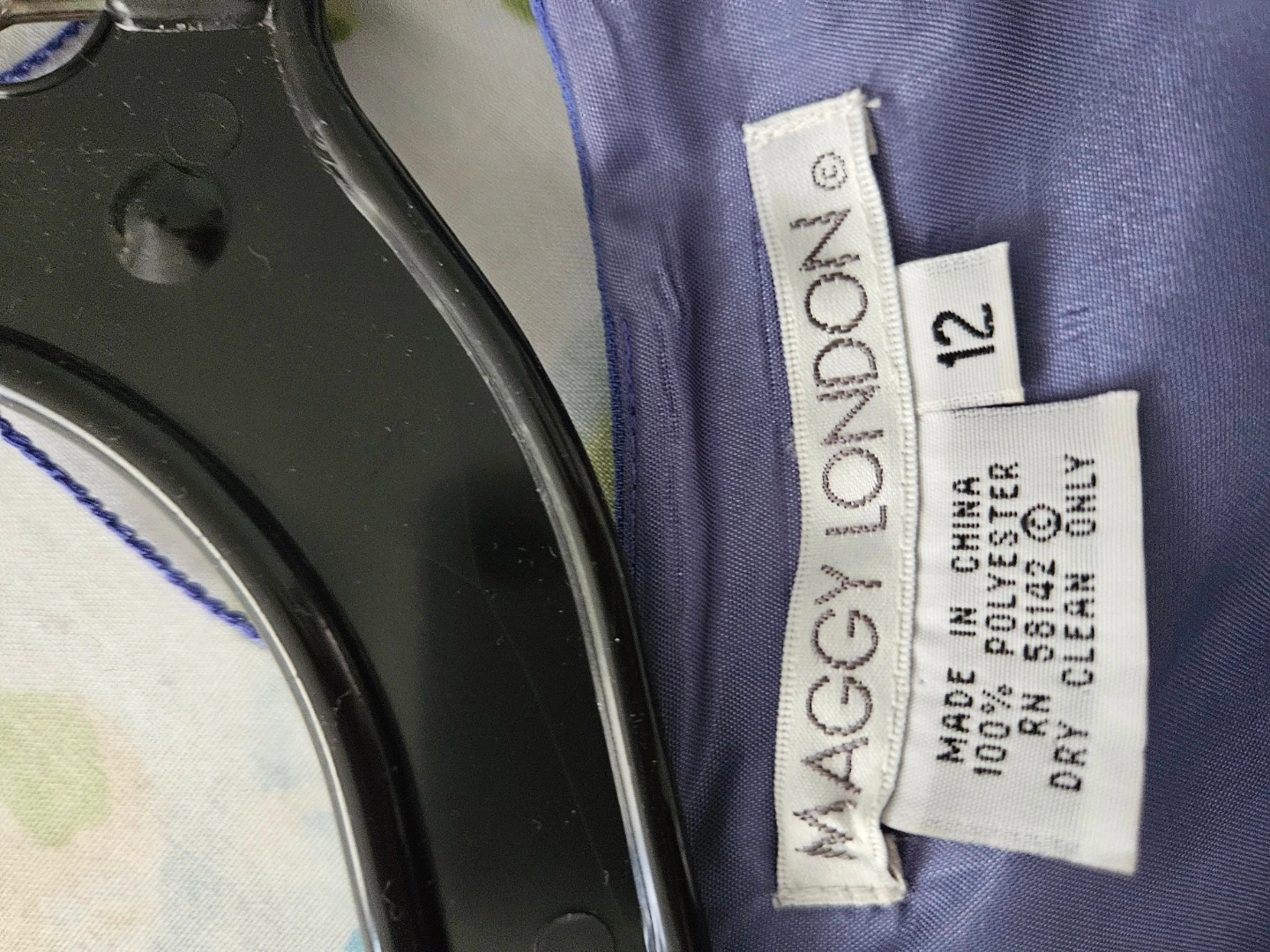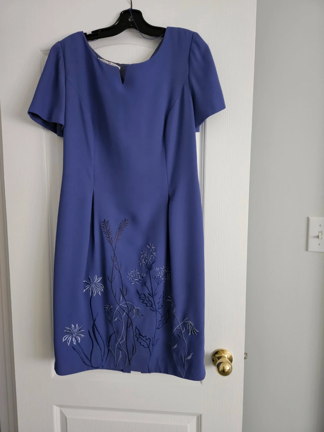 This Maggy London dress features a beautiful blue hue with delicate floral embroidery. It's a size 12 and made from 100% polyester. The dress is dry clean only. This piece is perfect for a sophisticated daytime event or a business casual setting.