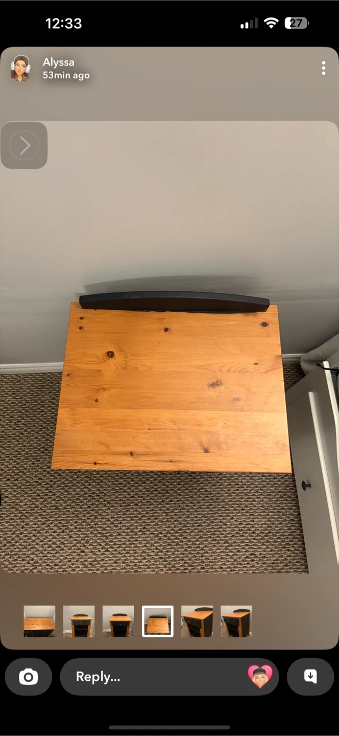 Wooden dresser with a pine top and black drawers. It has a total of 6 drawers for storage. This dresser would be handy for organizing clothes or linens.