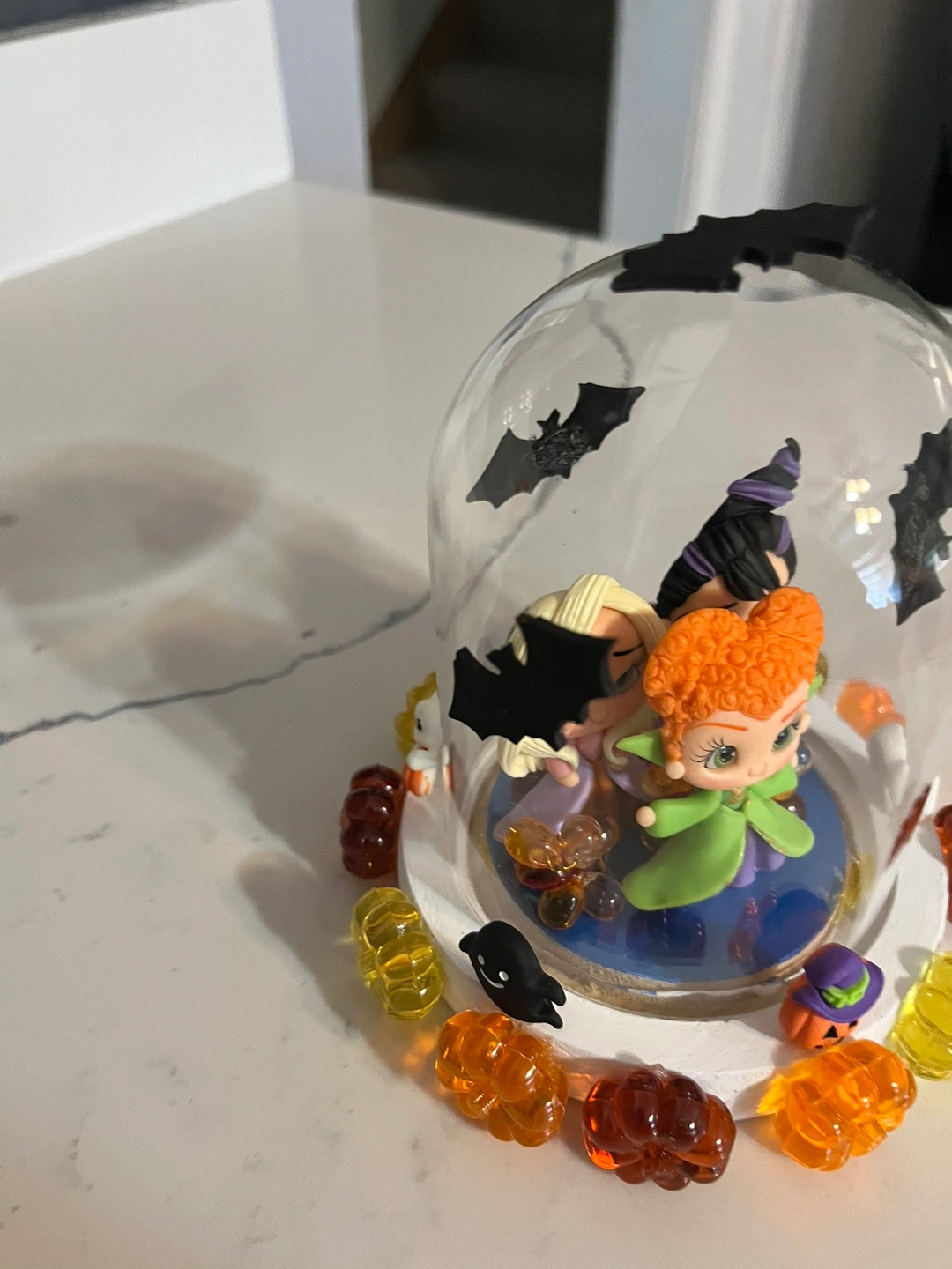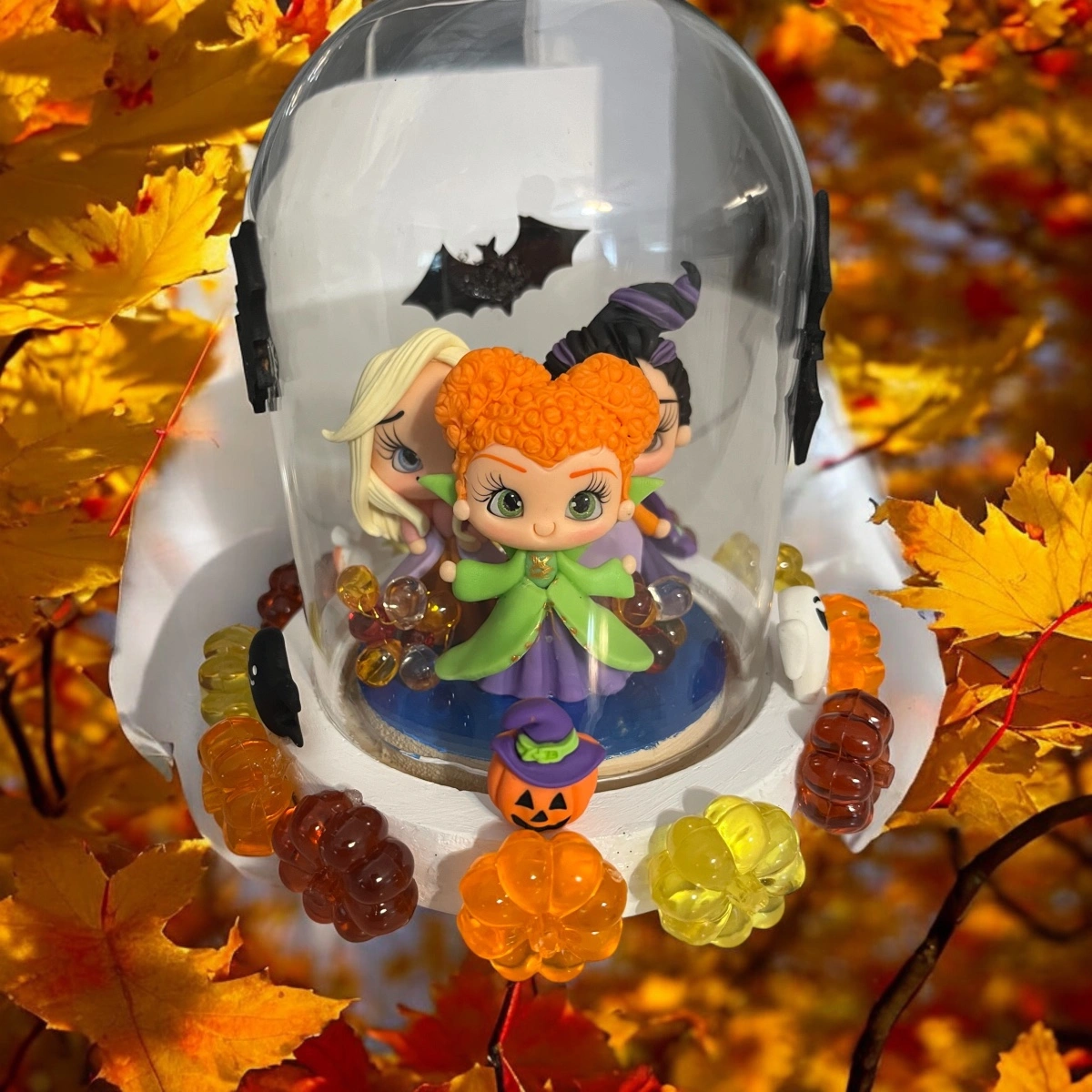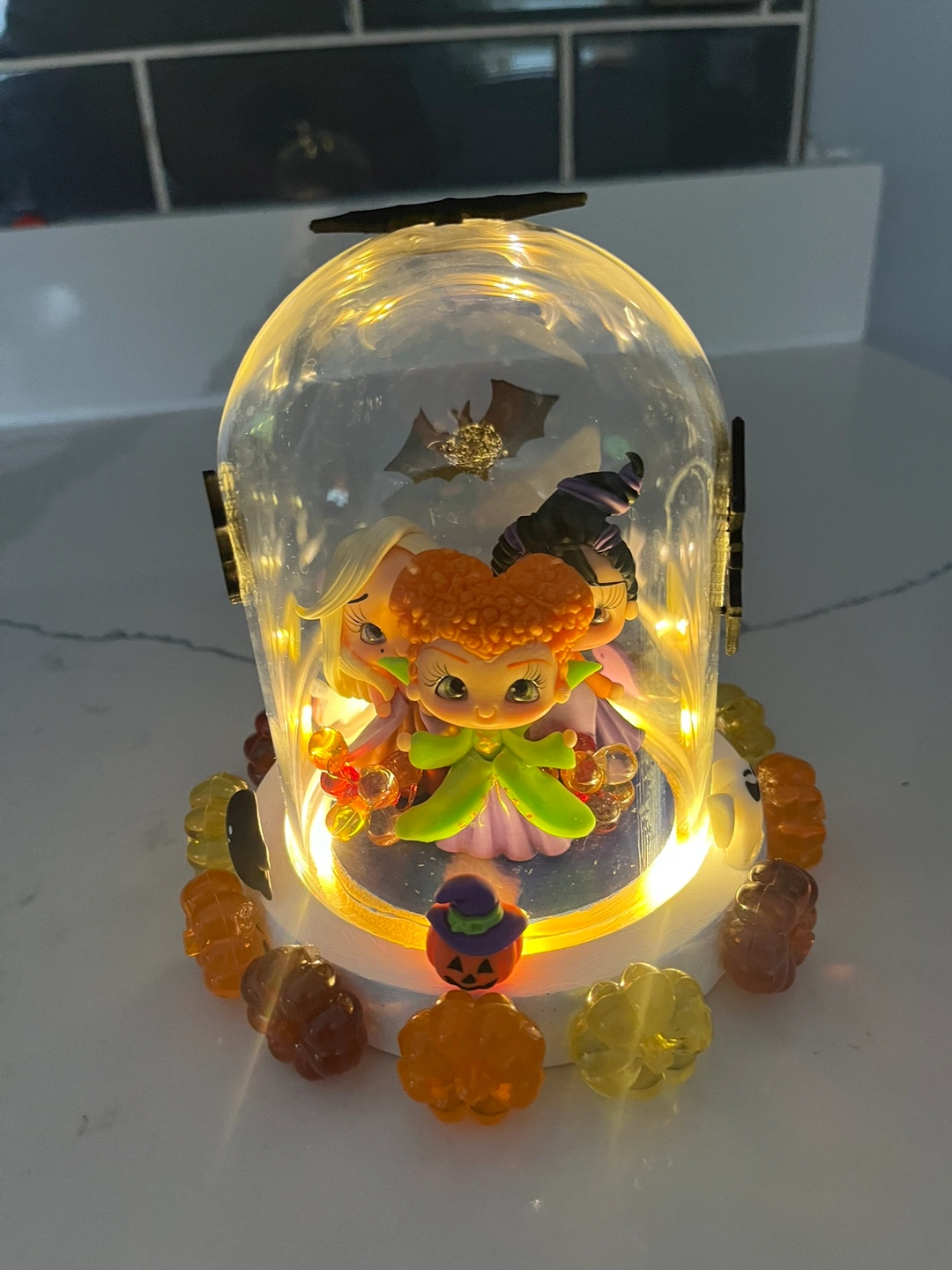 A light up display with the Sanderson Sisters from Hocus Pocus. The display is in a glass dome with bats. It includes a light that turns on and off with a switch. The base is decorated with Halloween candy.