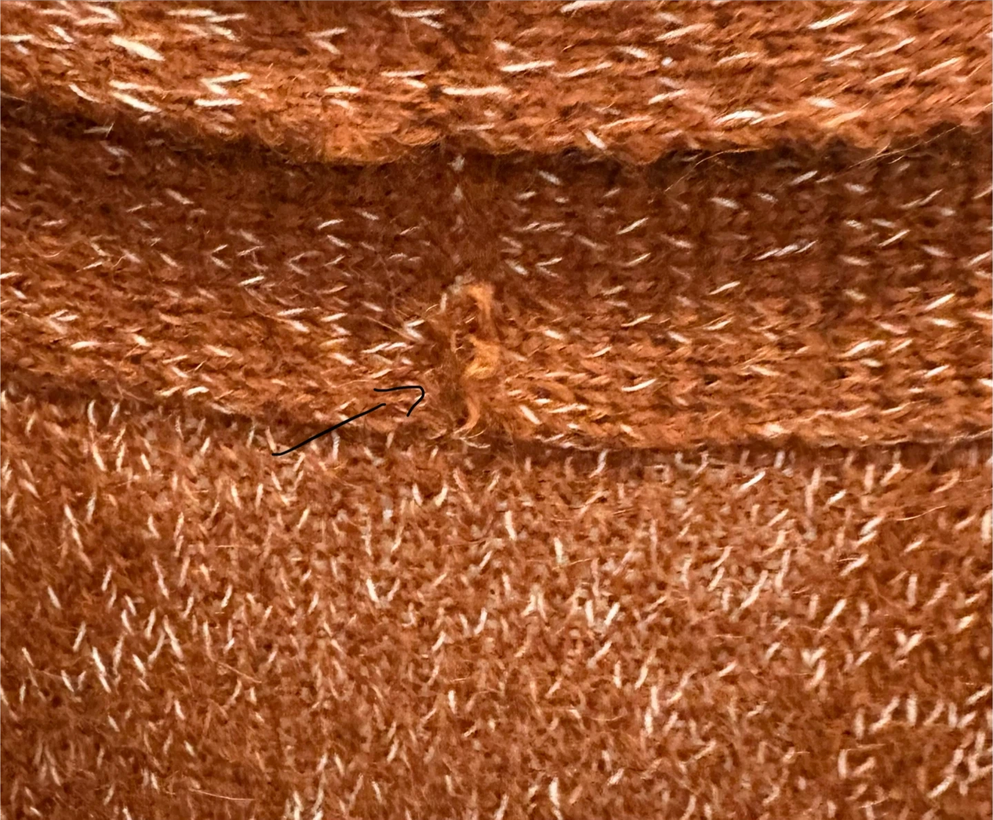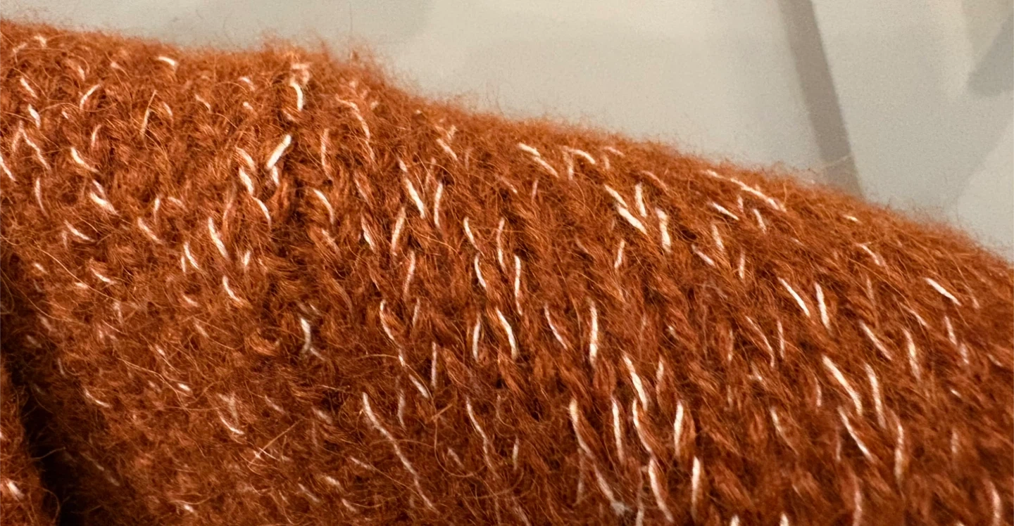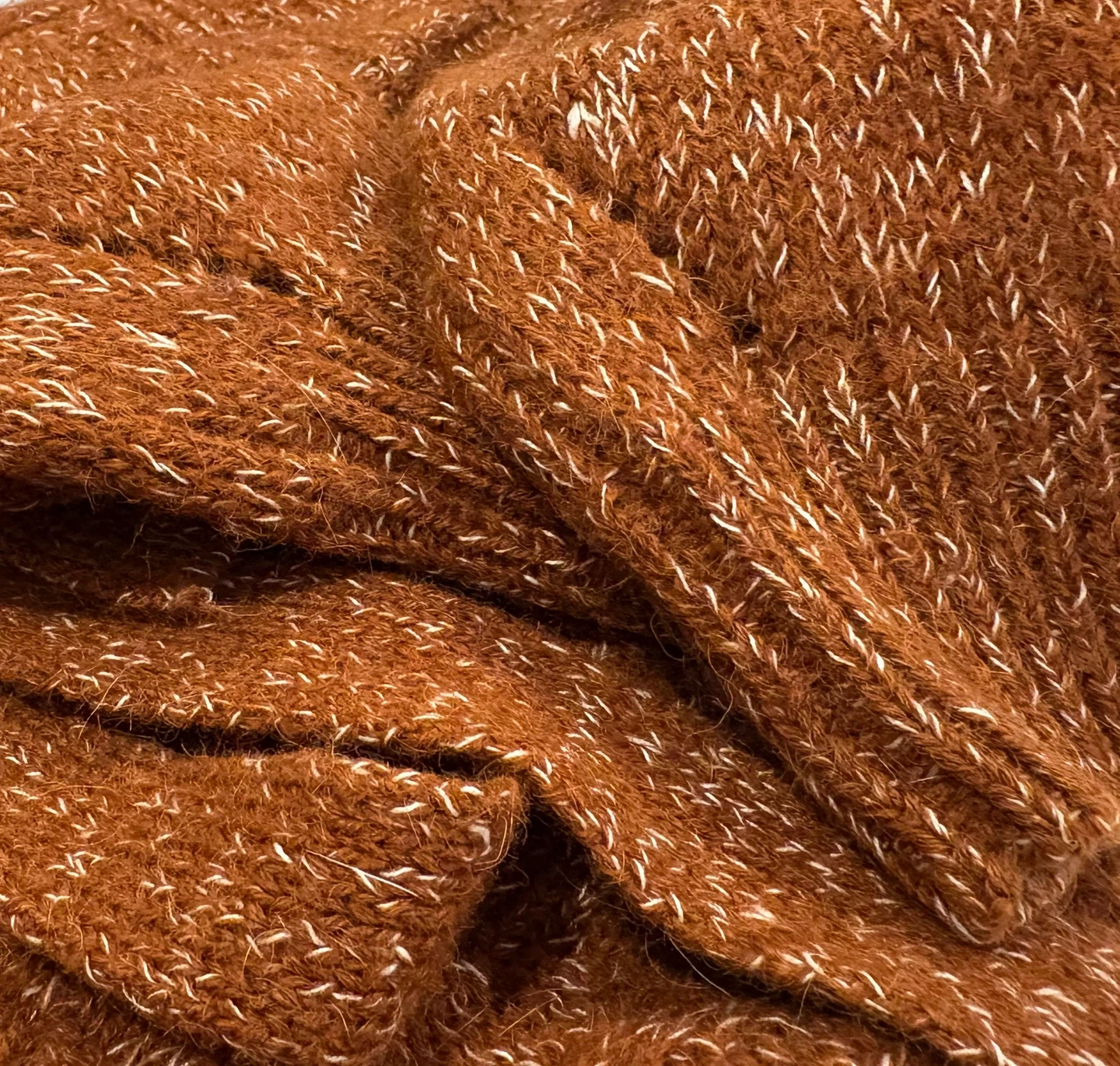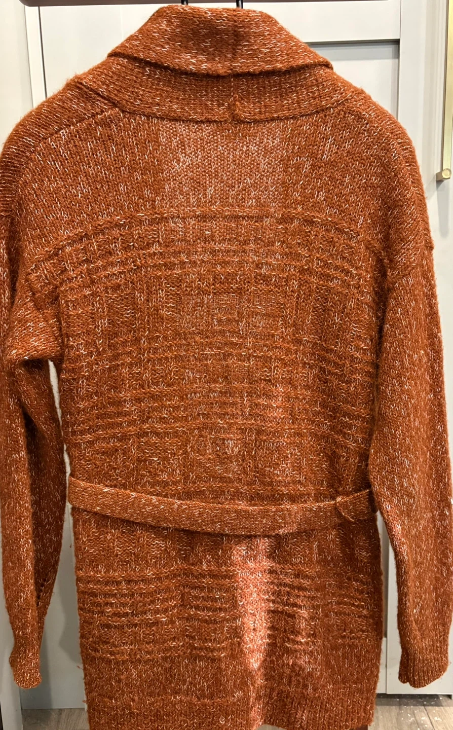 cozy rust-coloured cardigan features a shawl collar and a tie belt. Size Medium, made in China.