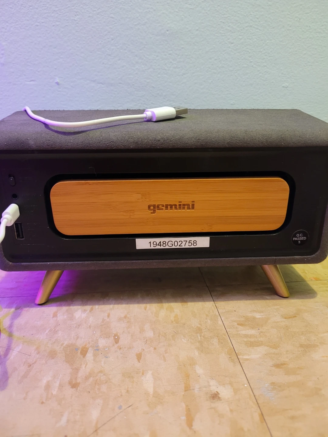 This Gemini speaker features a unique bamboo front panel with three speakers. It's a compact unit with a stylish design. Power and auxiliary inputs are located on the back.