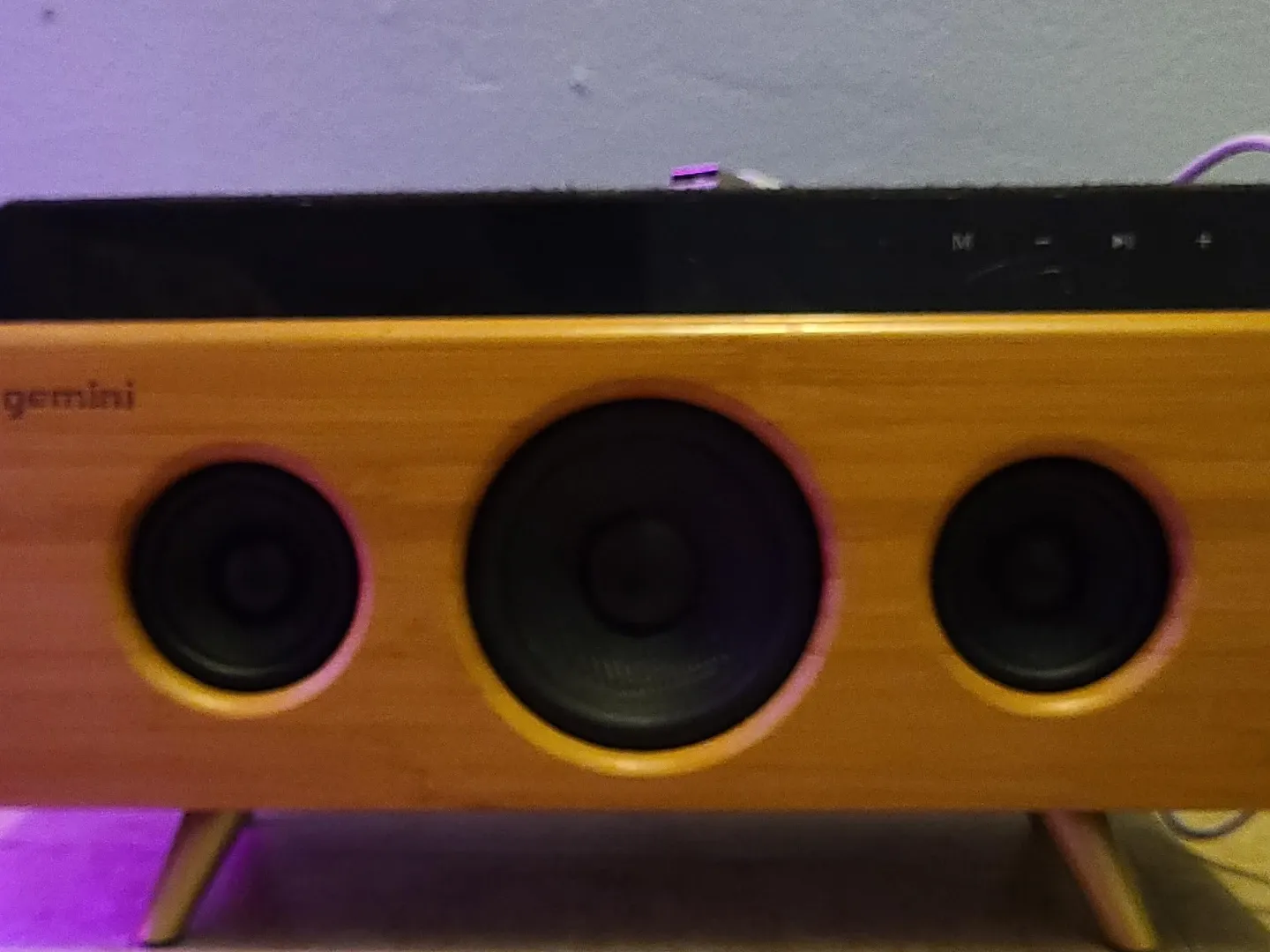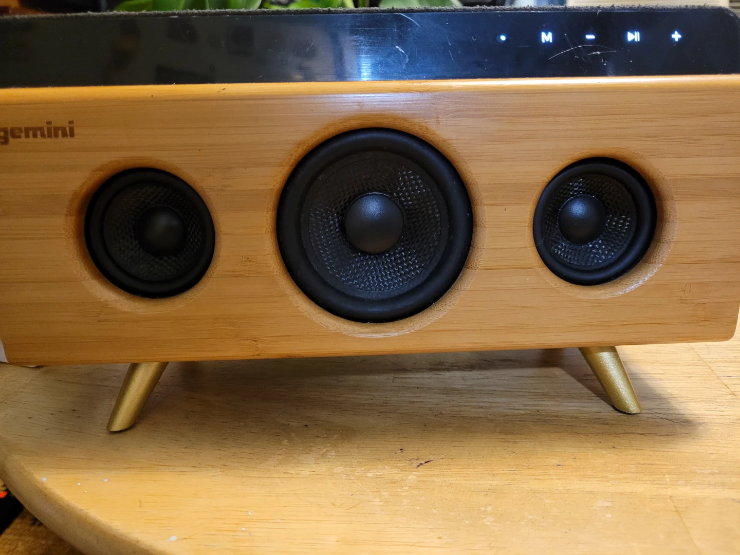 This Gemini speaker features a unique bamboo front panel with three speakers. It's a compact unit with a stylish design. Power and auxiliary inputs are located on the back.
