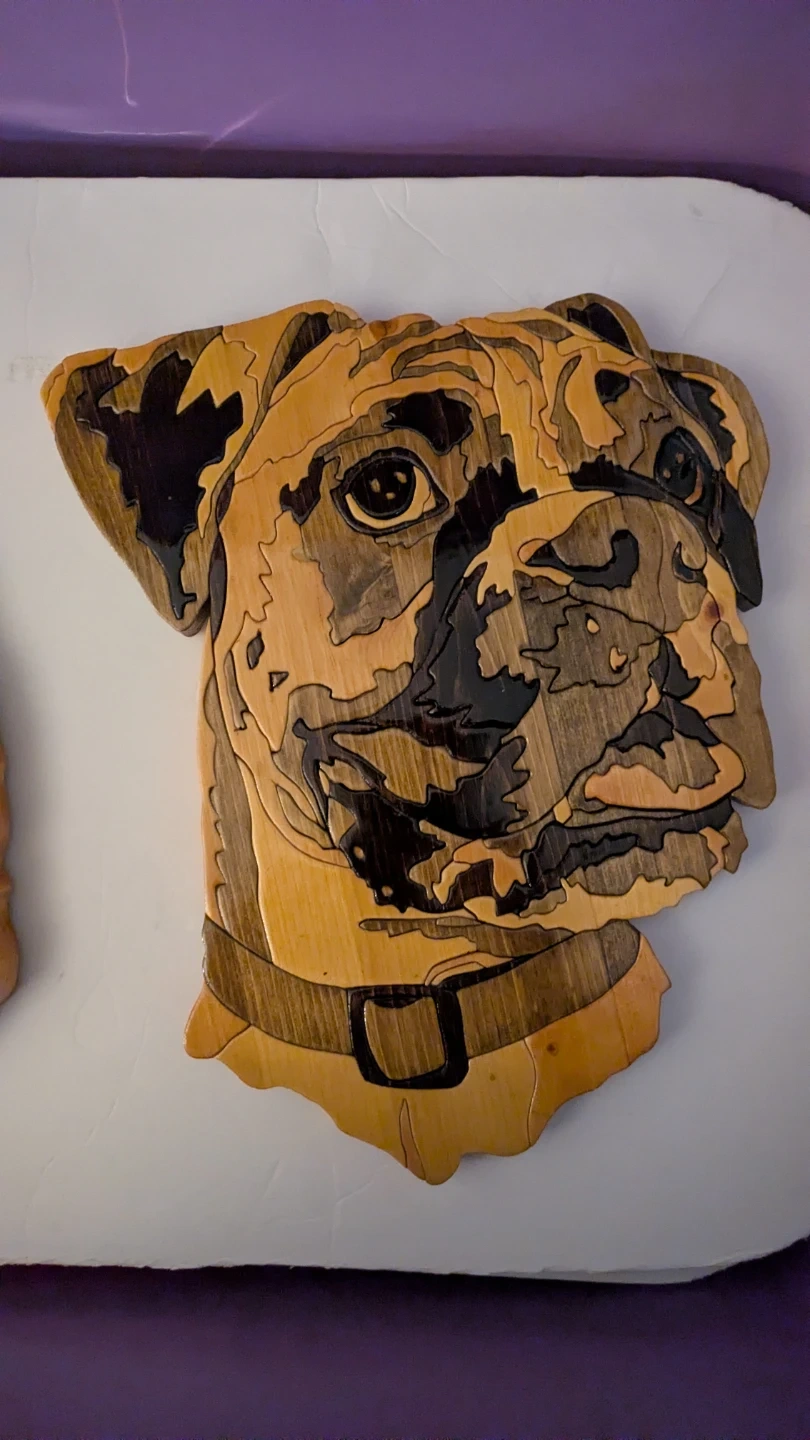 Wooden wall art intarsia piece featuring a Boxer dog's head. Wood in various natural tones and dark accents add sense of realism. This art piece has a collar detail.