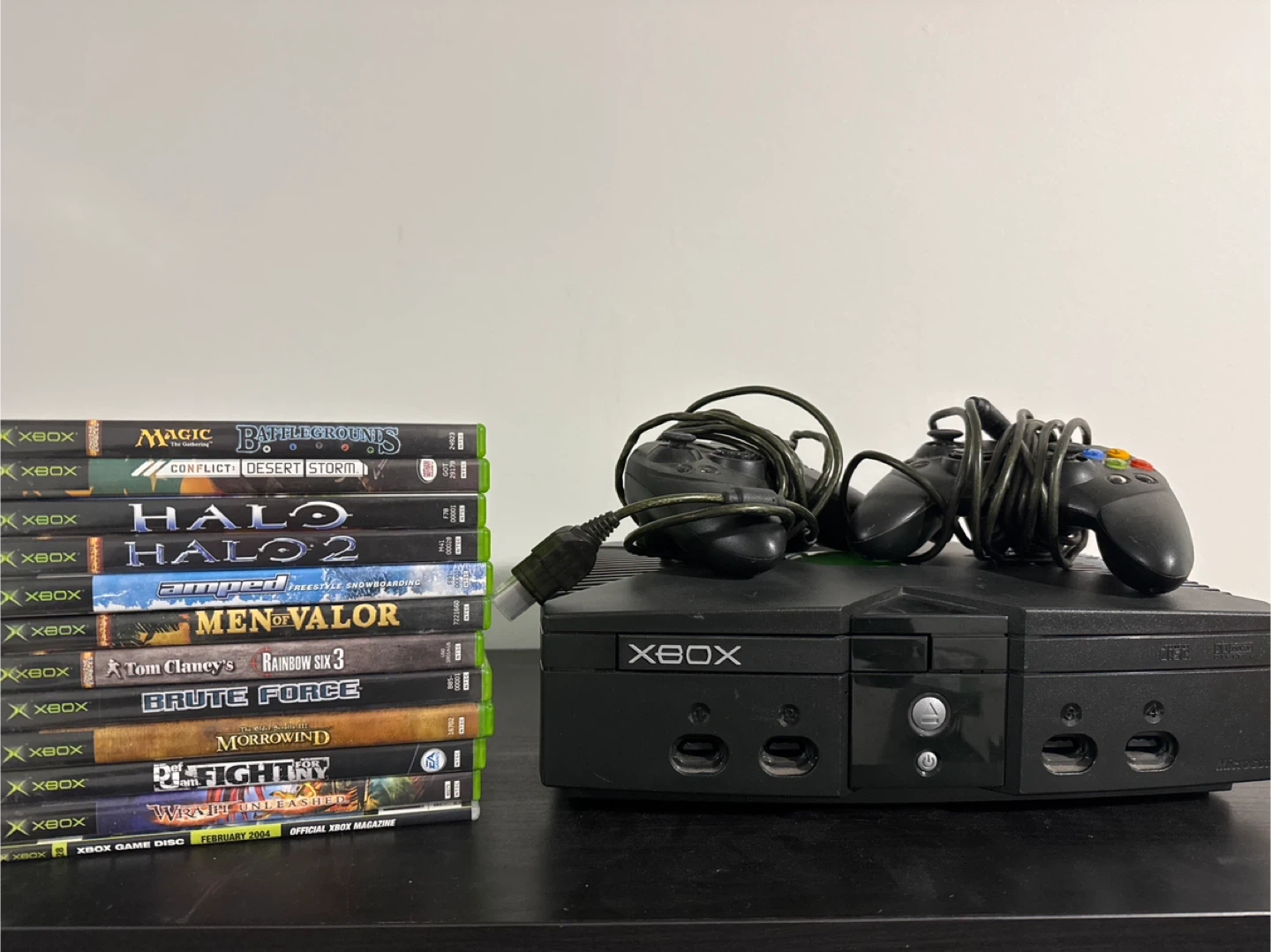Original Xbox console with two controllers included. A stack of 10 Xbox games is also part of this bundle. Games include Halo, Halo 2, Morrowind, and more!