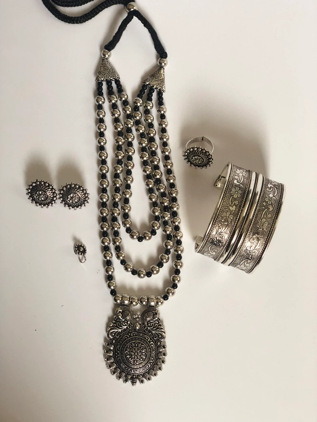 Selling a beautiful Oxidised silver-tone jewelry set! Includes a multi-strand beaded necklace, a ring, a pair of earrings, and a cuff bracelet. This set is perfect for adding a touch of elegance to any outfit