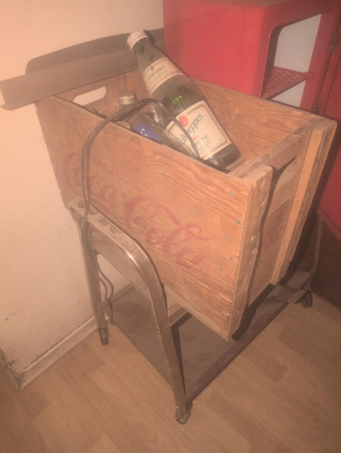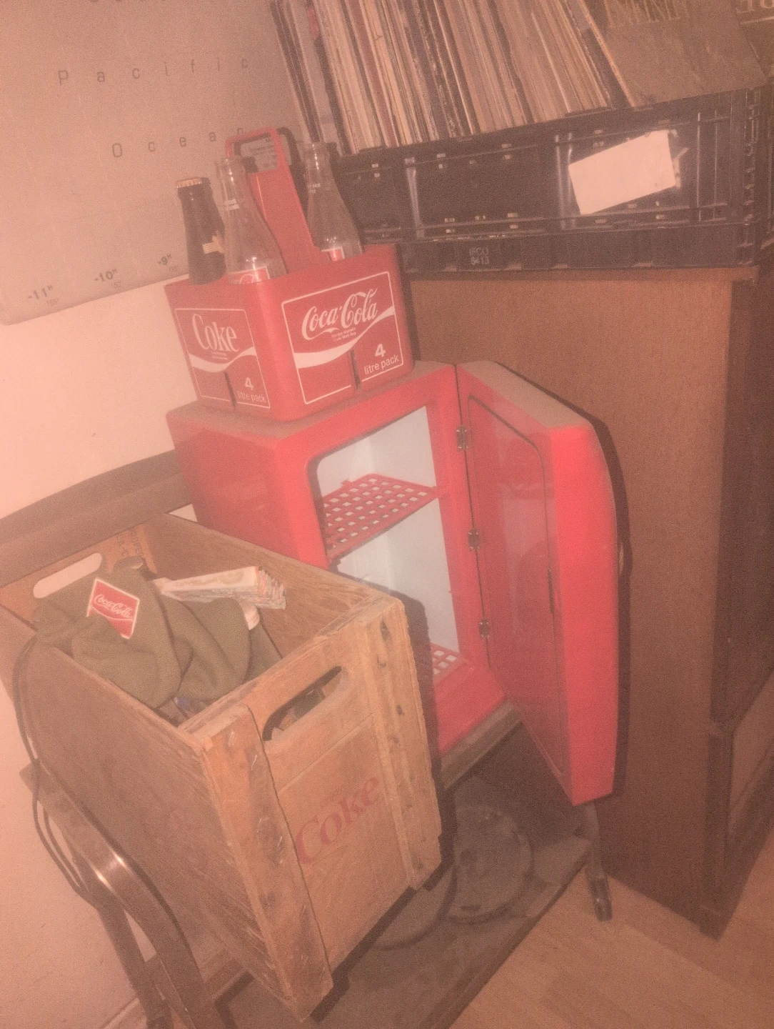 Classic red Coca-Cola mini fridge. It's perfect for keeping a few drinks cool! Includes a matching red 4-bottle carrier. This would be a great addition to a rec room or garage!