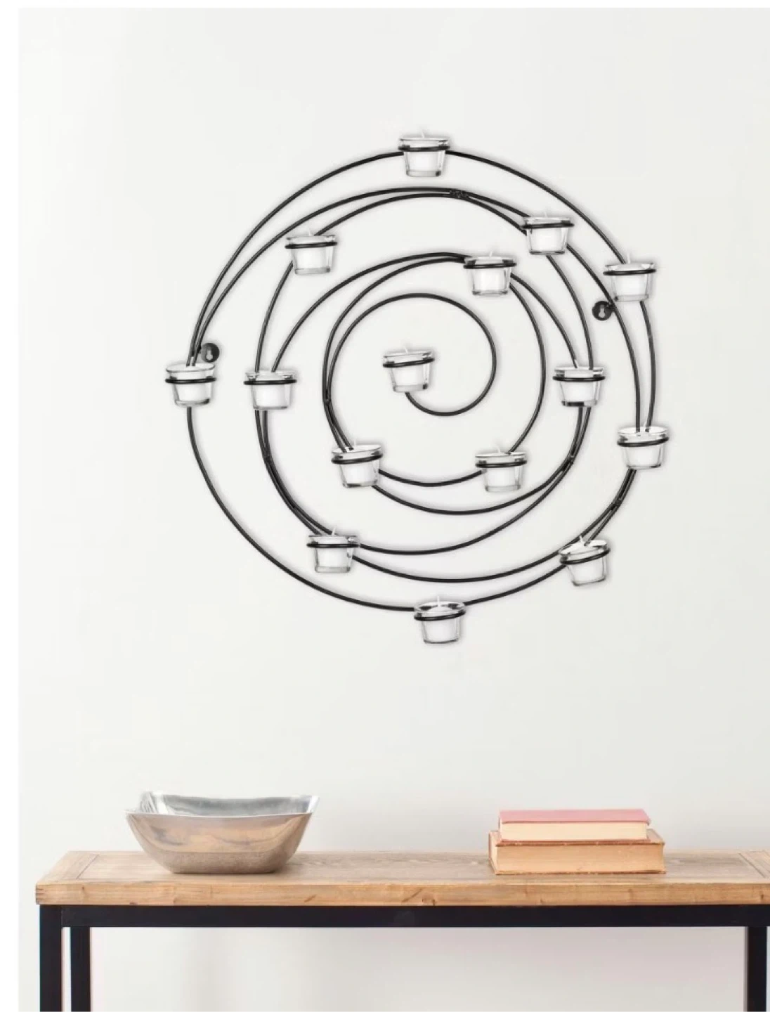 This unique wall sconce features a black metal spiral design. It holds twelve small glass votive holders. It's a great way to add ambient lighting to a room!